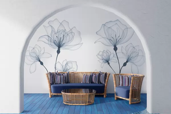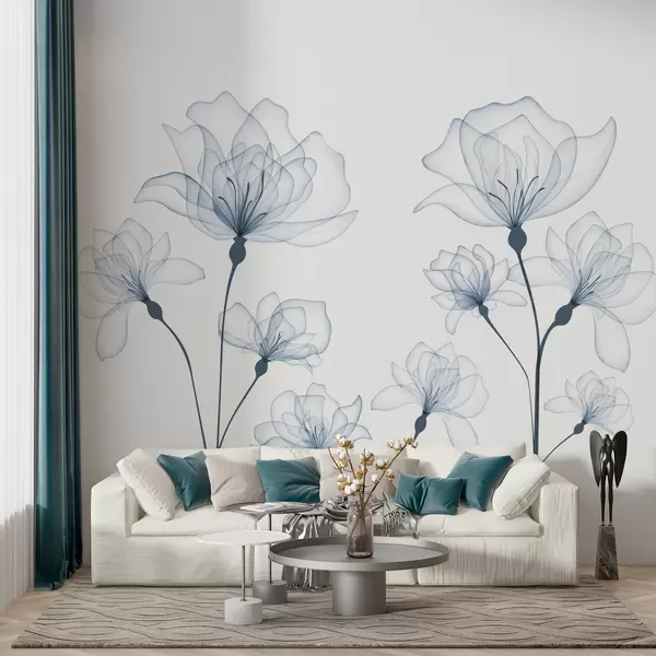 Transforming your living room with delicate blue watercolor flower wall murals introduces a serene and tranquil ambiance, enhancing the overall aesthetic. The soft tones of the flora create a calming effect, making the space feel more open and welcoming. This artwork harmonizes beautifully with natural light, emphasizing the intricate line art and allowing the gentle hues to breathe life into the room. The design seamlessly integrates flora and fauna elements, giving a refreshing vibe that invites relaxation and creativity into your home.