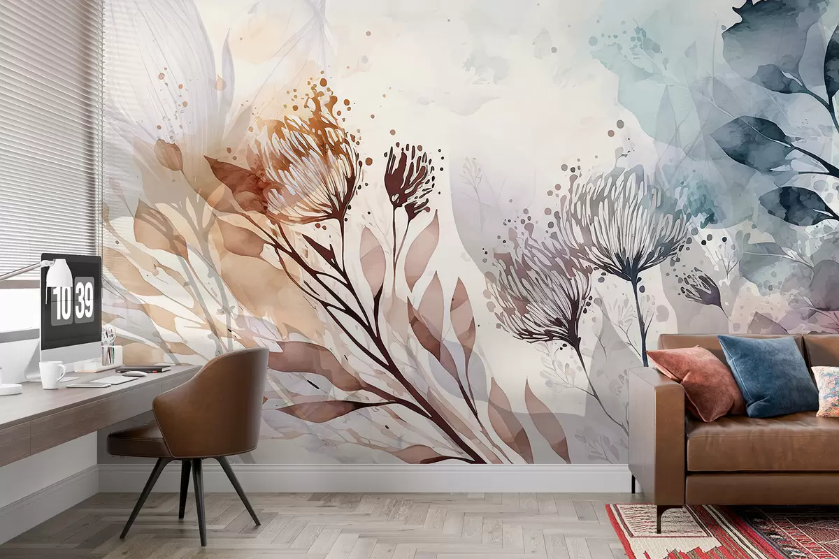 Wall murals Delicate floral abstract, stylized flowers and plant forms elements in muted, earthy tones watercolor art Nr. w00898