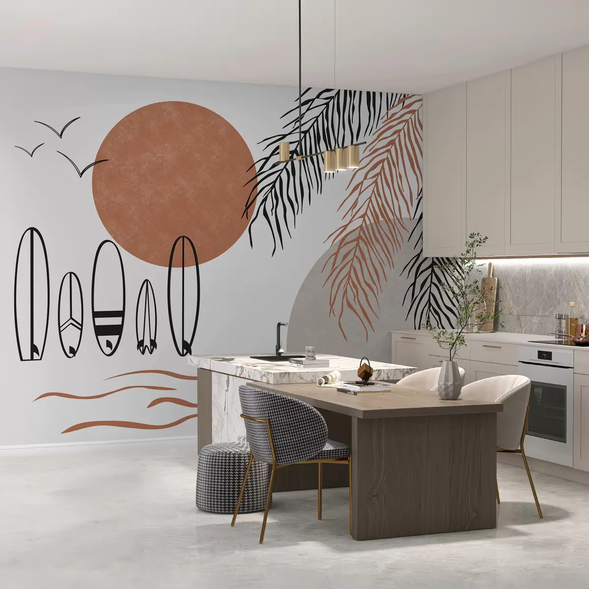 The addition of the Wall mural featuring surfboards and palm branches brings a refreshing coastal vibe to the living room. The black and red color scheme contrasts beautifully against the neutral light, creating an inviting atmosphere. The line drawings add a sense of artistic elegance, while the palm branches evoke a serene, tropical feel. This design enhances the overall space, making it feel more open and lively, perfect for relaxation and gatherings. The pastel tones complement the mural, creating a harmonious balance throughout the room.