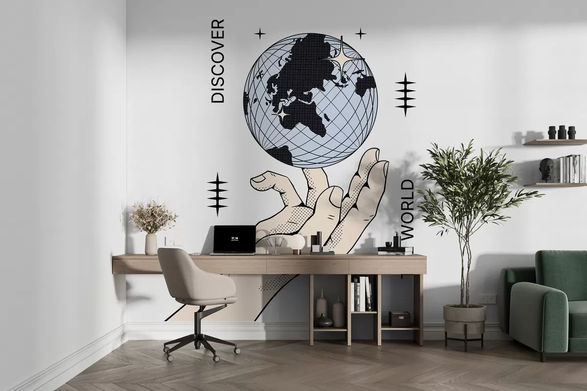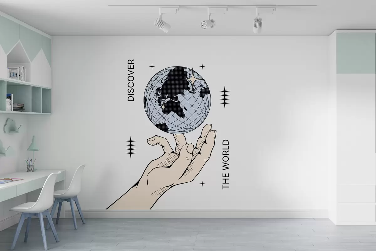 The addition of the beige hand spinning the globe wall mural brings a sense of tranquility and exploration to your living room. The elegant line art contrasts beautifully with the white background, creating a visually balanced focal point. The soft blue tones of the globe invoke feelings of serenity, while the global theme inspires curiosity and wanderlust. This mural enhances the overall ambiance, encouraging conversations and reflecting a love for discovery, making it a perfect addition for both relaxation and inspiration in your space.