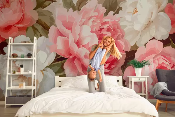 The addition of wall murals featuring pink and white peonies transforms the living room, infusing it with warmth and vibrancy. The soft hues create a serene atmosphere, enhancing natural light and making the space feel larger. The floral design brings a touch of nature indoors, evoking a sense of calm and relaxation. This delightful scenery acts as a stunning focal point, inviting admiration while providing a pleasant backdrop for gatherings. Overall, the peonies elevate the decor, harmonizing beauty with comfort.