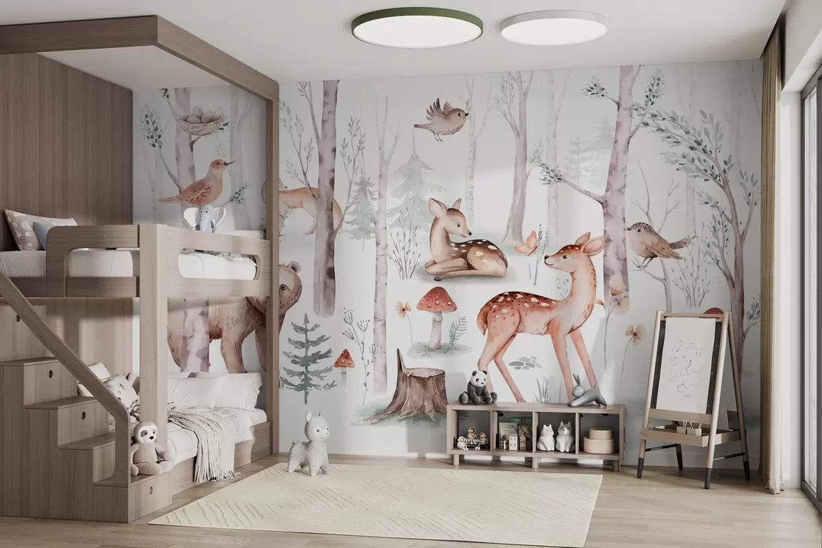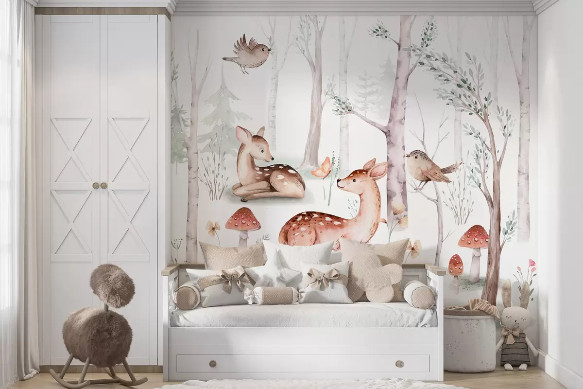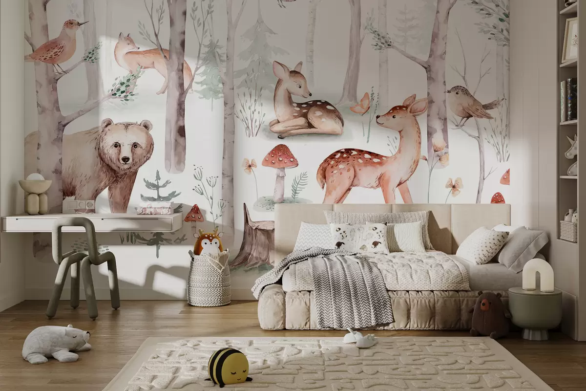 Transforming the children's room with delicate watercolor forest animals wallpaper creates a serene and enchanting atmosphere. The warm pastel colors on a white background evoke a sense of calmness, inviting creativity and imagination. The playful depiction of woodland creatures fosters a connection with nature, making it a delightful space for play and learning. This wallpaper not only enhances the aesthetic appeal but also complements a neutral light environment, perfect for nurturing a peaceful, dreamy ambiance.