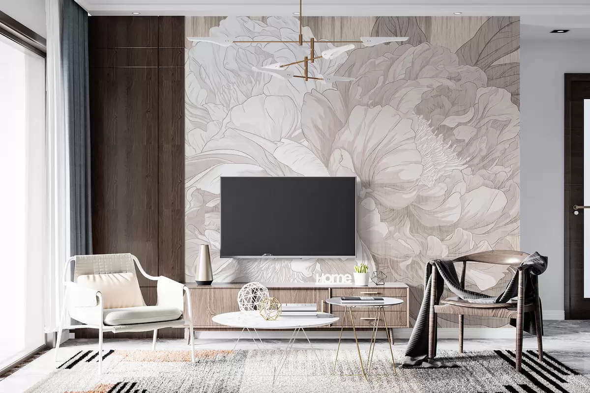 Transforming your living room with the textured wall mural of large peony flowers in beige shades brings an enchanting touch of nature indoors. The delicate line art beautifully contrasts with the neutral light tones, creating a serene and inviting atmosphere. This backdrop enhances the overall aesthetics, making the space feel more spacious and rejuvenating. The floral design infuses a sense of tranquility, allowing for a perfect relaxation zone while fostering a lovely connection to flora and fauna.
