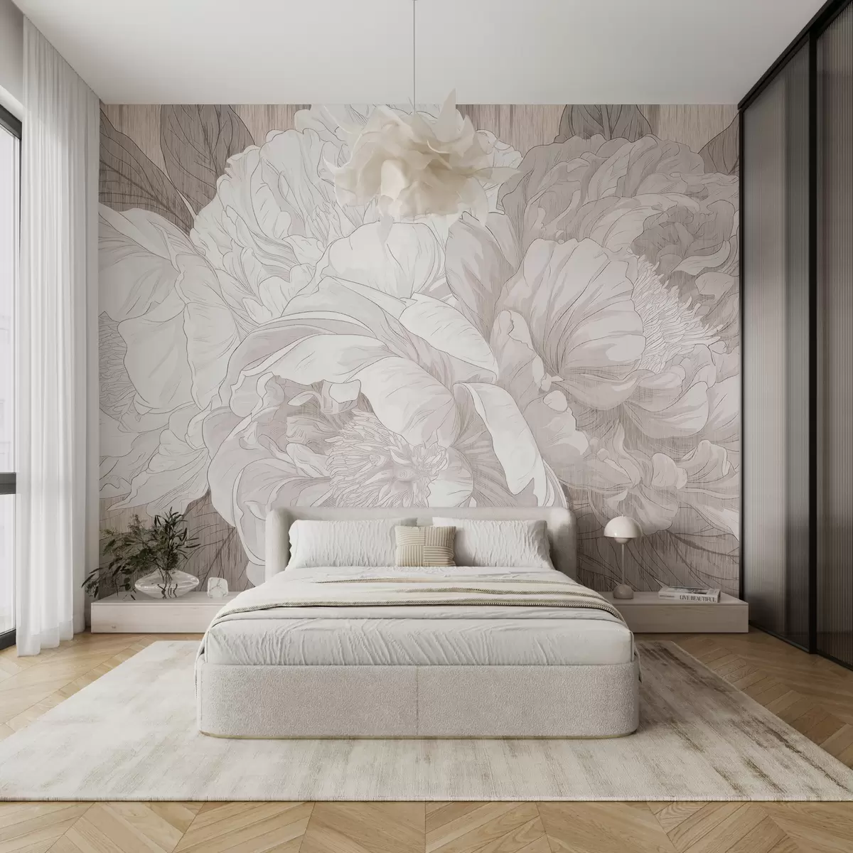 Transforming your living room with the textured wall mural of large peony flowers in beige shades brings an enchanting touch of nature indoors. The delicate line art beautifully contrasts with the neutral light tones, creating a serene and inviting atmosphere. This backdrop enhances the overall aesthetics, making the space feel more spacious and rejuvenating. The floral design infuses a sense of tranquility, allowing for a perfect relaxation zone while fostering a lovely connection to flora and fauna.
