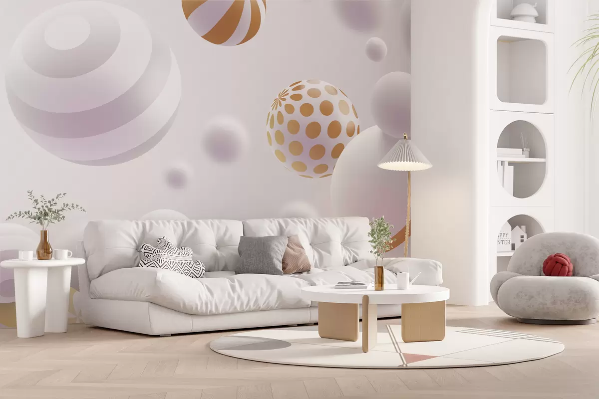 The living room transforms into a serene space with the installation of Wall murals featuring volumetric 3D-style flying spheres in light gray tones with orange accents. The neutral light from the walls enhances the airy feel, while the 3D geometric shapes create depth and visual intrigue. The circular patterns bring a harmonious balance, making the room feel more inviting and spacious. This subtle yet striking design attracts the eye and creates a modern, sophisticated atmosphere ideal for relaxation and social gatherings.