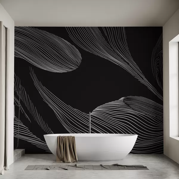 Introducing the Wall murals Abstraction on a black background transforms your living room into a chic and sophisticated space. The clean line art adds depth, creating a striking contrast against the dark backdrop. This feature wall draws the eye and becomes an intriguing focal point, infusing the room with modern elegance. The minimalist design harmonizes with various decor styles, enhancing the overall atmosphere. This stylish addition fosters a sense of calm and creativity, making your living area feel inviting and inspiring.