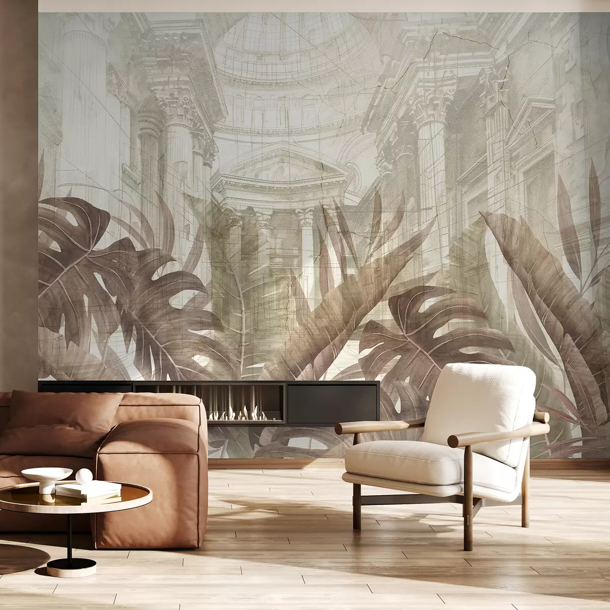 Transforming the living room with the wall mural featuring ornate architectural marble columns and lush tropical plants instantly enhances the space. The neutral light complements the soft beige tones, creating a serene and inviting atmosphere. The grand drawing evokes a sense of elegance and sophistication, while the sepia plants add a warm, organic touch. Together, these elements foster a harmonious blend of nature and classic architecture, making the room feel more open and tranquil, perfect for relaxation and gatherings.