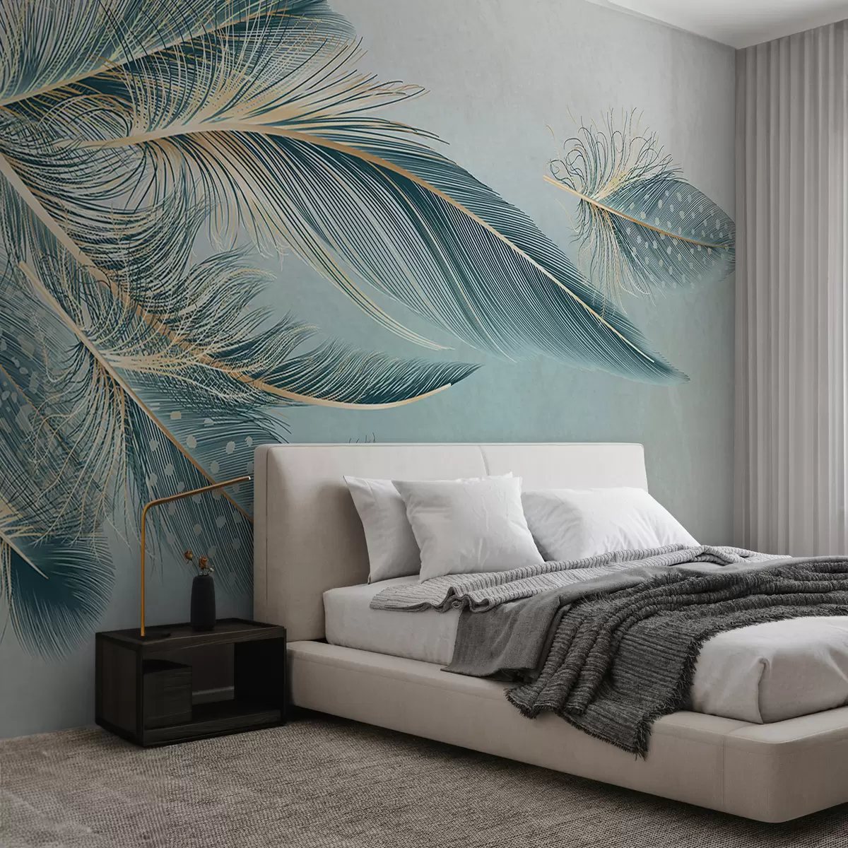 The addition of delicate feather wall murals in shades of blue transforms the living room into a serene oasis. The soft hues create a calming ambiance, enhancing the overall atmosphere. The artwork complements neutral lighting beautifully, highlighting the intricate feather designs while adding a touch of elegance. The space feels more spacious and inviting, creating a perfect backdrop for relaxation and conversation. The delicate patterns infuse a sense of tranquility, making the room a stylish retreat from the everyday hustle.
