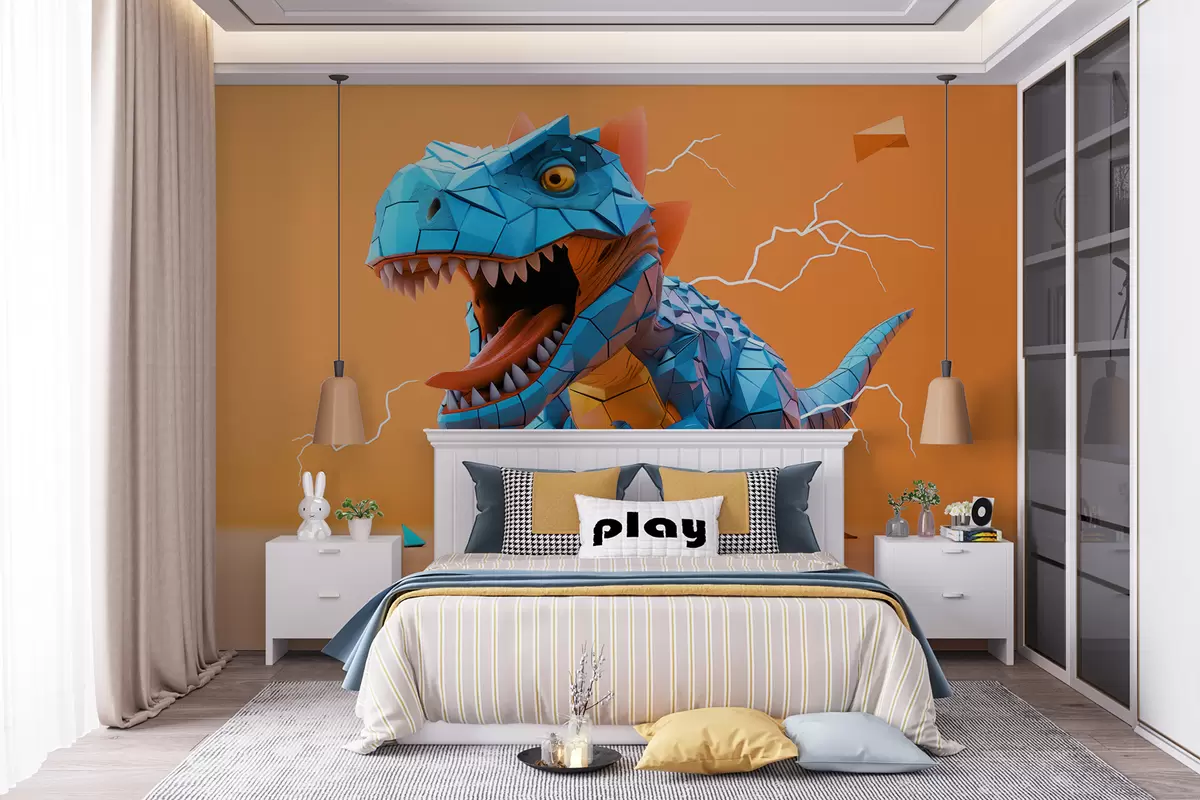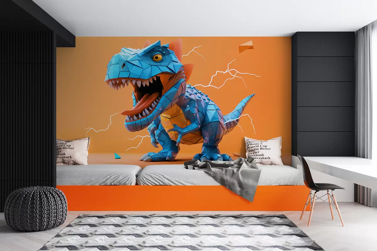 Transforming your living room with the Wall murals Ferocious dinosaur featuring a lightning strike in vibrant yellow and blue brings an exhilarating energy to the space. The dynamic design captures attention, creating a lively focal point that sparks conversation. The striking colors enhance the overall brightness, making the room feel more inviting and cheerful. The 3D effect adds depth, giving the illusion of an engaging scene that immerses you in a playful atmosphere, perfect for both relaxation and entertainment.