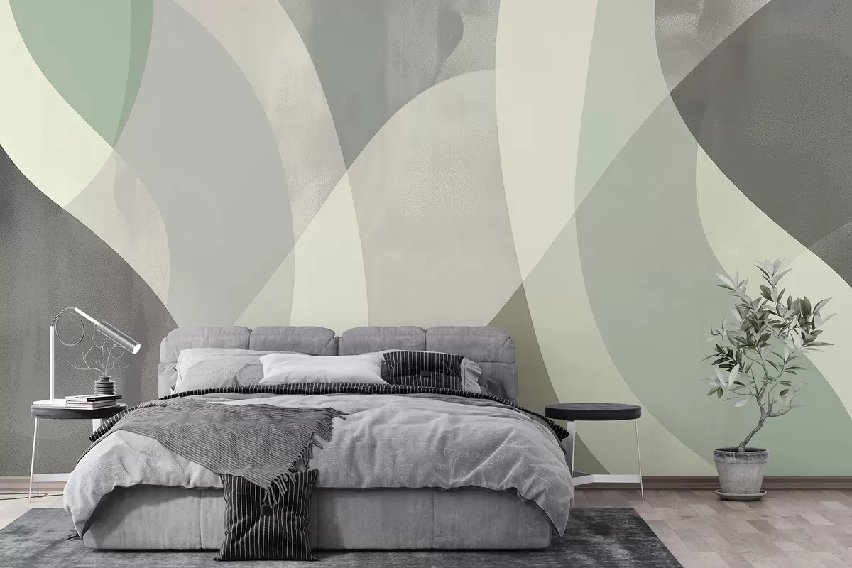 The introduction of the wall mural featuring soft curves in muted tones has transformed the living room into a serene oasis. The flowing lines and green gradients create a calming atmosphere, enhancing the room's sense of space and tranquility. Neutral light gently interacts with the mural, inviting a peaceful ambiance that promotes relaxation. The circular motifs provide a touch of modernity while maintaining a minimalist aesthetic, making the space feel both contemporary and warm. This design choice elevates the overall interior, fostering a harmonious and inviting environment.