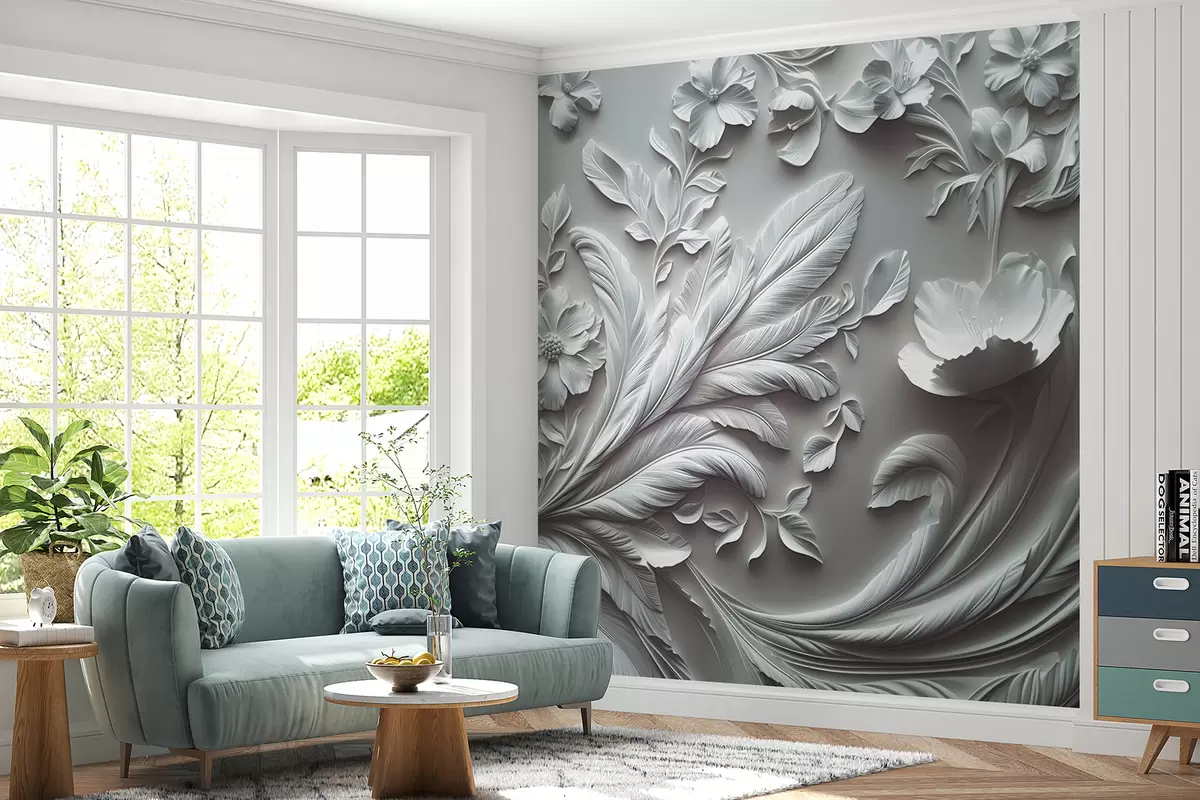 Transforming the living room with exquisite raised flowers and leaves in gray tones has brought a sophisticated elegance to the space. The intricate 3D flowers create depth and visual interest, making the room feel more inviting and serene. This stylish mural complements the beige color palette, blending seamlessly with the decor while enhancing the flora and fauna theme. The delicate floral designs evoke a sense of nature, infusing the area with tranquility and making it a perfect setting for relaxation or gatherings.