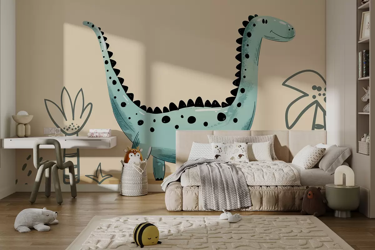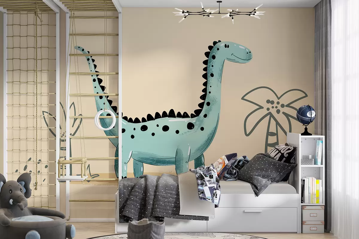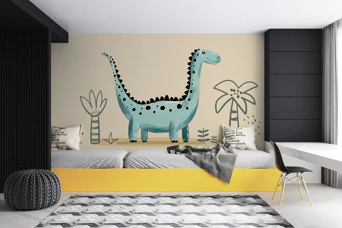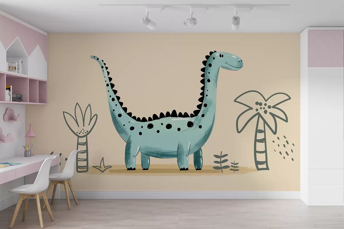 After adding the cute dinosaur wall mural to your living room, the space transforms into a whimsical retreat. The beige background creates a neutral light that softens the overall ambiance, making it feel inviting and cozy. The playful dinosaur and palm tree details evoke a sense of joy and creativity, perfect for both children and adults. This mural not only enhances the aesthetic appeal but also sparks imagination, making your living area a cheerful and dynamic environment.