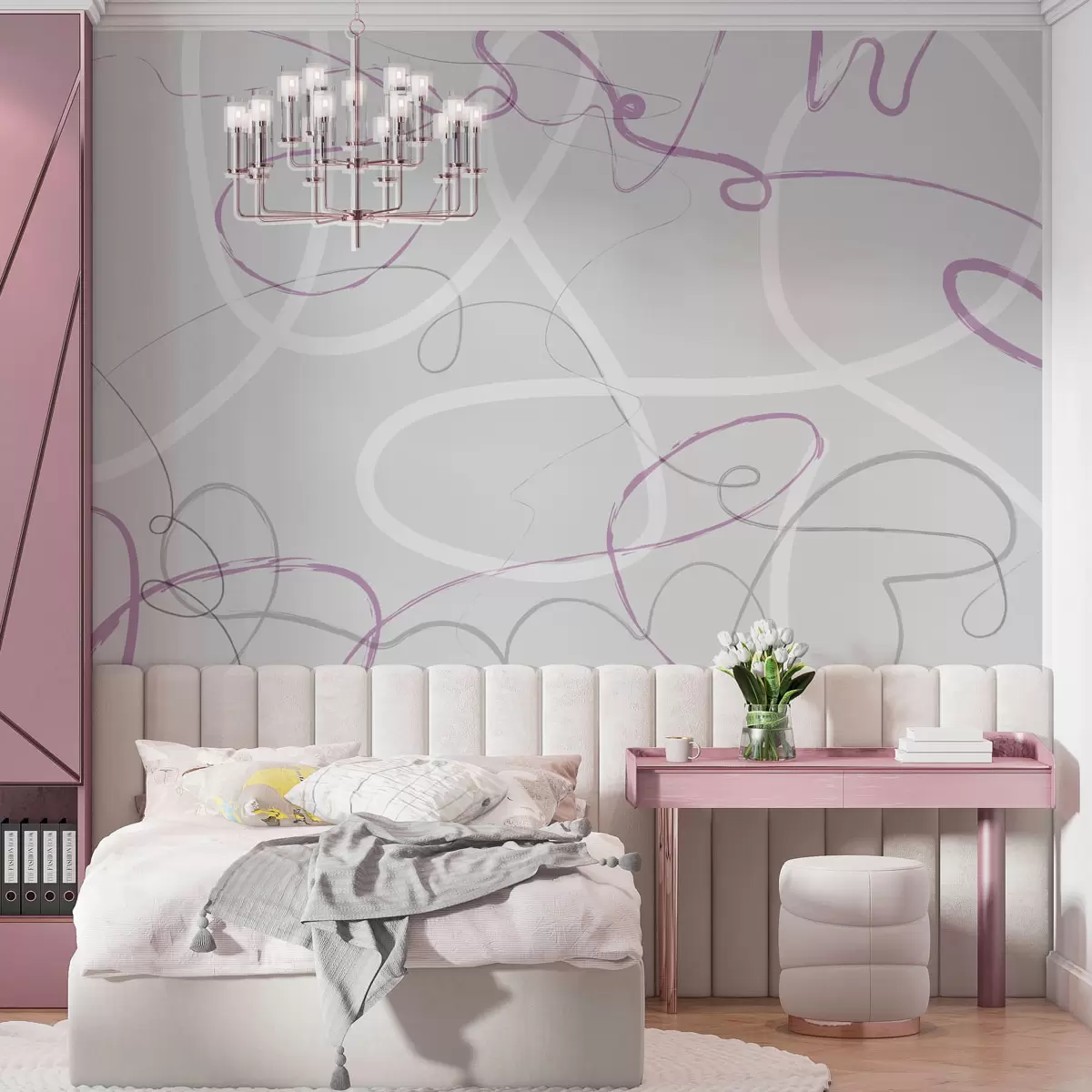 The introduction of the abstract purple lines mural creates a striking focal point in the living room. The mauve hues effortlessly blend with the gray backdrop, adding depth and sophistication to the space. The modern dance of lines evokes a sense of fluidity and movement, transforming the atmosphere into one of creativity and inspiration. This mural not only uplifts the wall but also enhances the overall aesthetic, making the room feel more dynamic and inviting. Its artistic flair encourages conversation and admiration, redefining the living area beautifully.