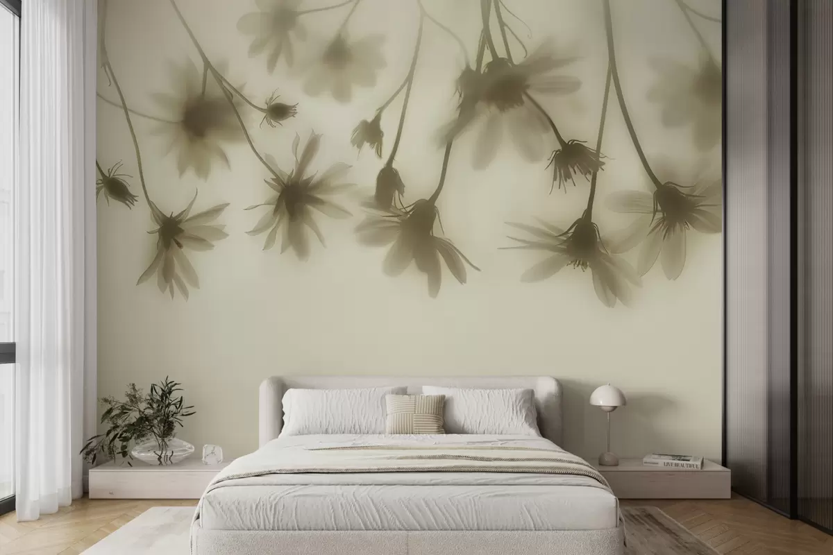 The Wall mural featuring delicate flowers in fog transforms the living room into a serene oasis. The pastel colors create a calming atmosphere, enhancing the natural light that filters through the space. Daisies gently hanging from above add a touch of grace, making the room feel airy and open. This infusion of flora creates a harmonious connection with nature, encouraging relaxation and tranquility. The overall effect is a bright, inviting space that fosters a sense of peace and refreshment, perfect for unwinding.