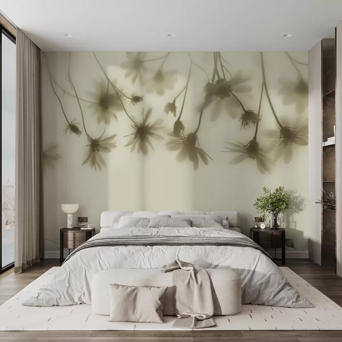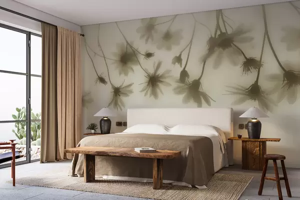 The Wall mural featuring delicate flowers in fog transforms the living room into a serene oasis. The pastel colors create a calming atmosphere, enhancing the natural light that filters through the space. Daisies gently hanging from above add a touch of grace, making the room feel airy and open. This infusion of flora creates a harmonious connection with nature, encouraging relaxation and tranquility. The overall effect is a bright, inviting space that fosters a sense of peace and refreshment, perfect for unwinding.