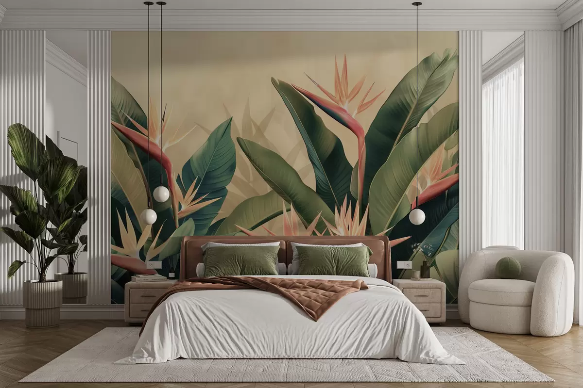 Transforming the living room with the wall mural featuring a lush arrangement of tropical flowers and dark green leaves brings a refreshing ambiance. The neutral light illuminates the space, enhancing the vibrant flora and fauna. The mural acts as a stunning focal point, infusing the area with a sense of tranquility and vitality. The beige tones complement the greenery, creating a harmonious balance that invites relaxation and a touch of nature indoors. Overall, the room feels more inviting and alive, perfect for relaxation or social gatherings.