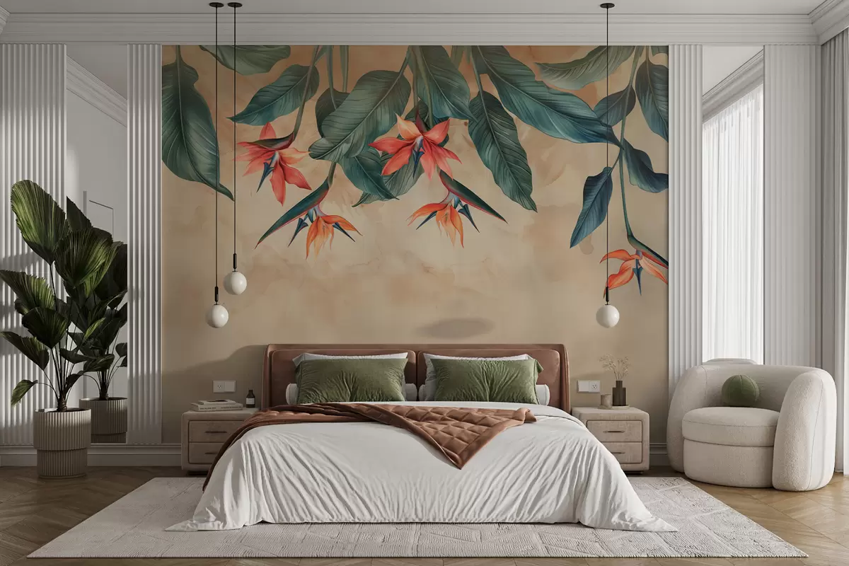 The addition of the Tropical Bloom mural on a beige watercolor background transforms the living room, infusing it with a sense of serenity and warmth. The vibrant flora and fauna create a lively atmosphere, while the tropical trees bring a touch of the exotic indoors. Neutral light enhances the mural's hues, making it a focal point that invites relaxation and connection to nature. This uplifting change enriches the space, making it feel more inviting and harmonious, perfect for both gatherings and quiet moments.