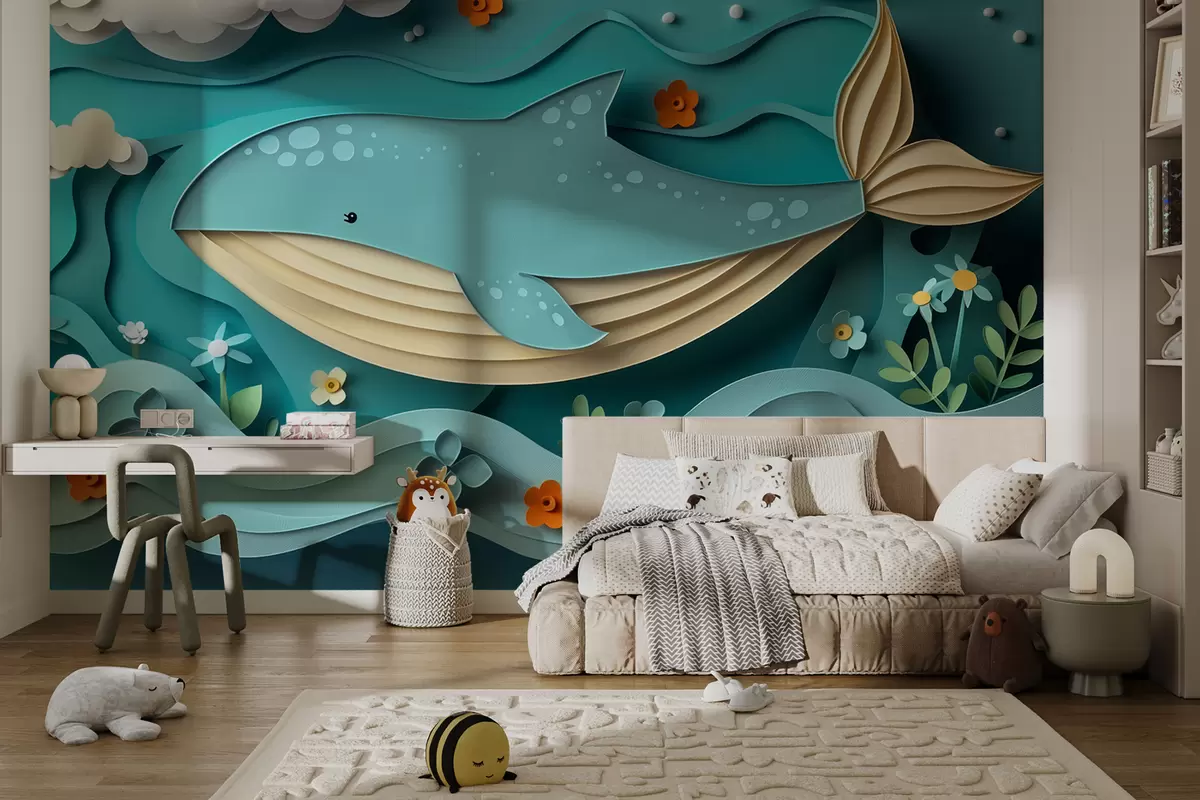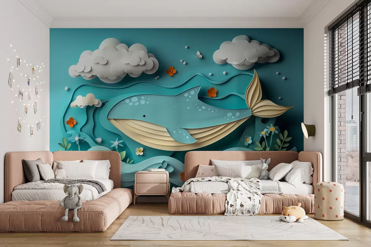 The addition of the playful whale mural in paper cut style transforms the living room into a vibrant and whimsical oasis. The soft turquoise backdrop complements the layers of flora and fauna, creating a serene atmosphere. The 3D effect brings the whale and clouds to life, evoking a sense of joy and wonder. This artwork not only enhances the visual appeal but also fosters a playful environment, making the space feel more dynamic and inviting, perfect for relaxation or entertaining guests.