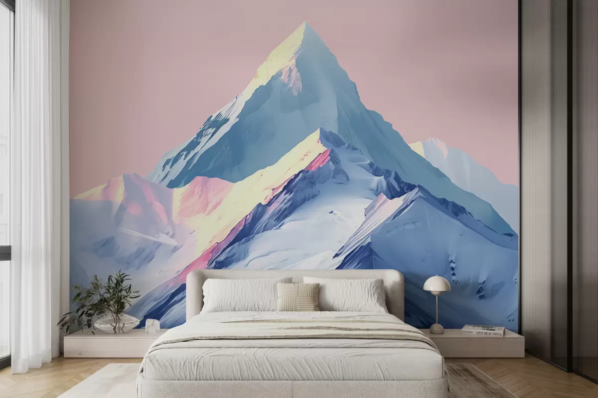 Transforming your living room with the wall mural of blue and pink mountains adds a serene and refreshing vibe to the space. The pastel hues create a calming atmosphere, making the room feel more open and inviting. Mountain peaks in a drawn style add an artistic touch, blending seamlessly with various decor styles. This mural serves as a stunning focal point, encouraging conversations and relaxation. Overall, it enhances the aesthetic appeal while promoting a sense of tranquility and connection to nature.