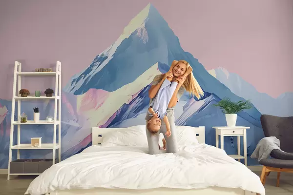 Transforming your living room with the wall mural of blue and pink mountains adds a serene and refreshing vibe to the space. The pastel hues create a calming atmosphere, making the room feel more open and inviting. Mountain peaks in a drawn style add an artistic touch, blending seamlessly with various decor styles. This mural serves as a stunning focal point, encouraging conversations and relaxation. Overall, it enhances the aesthetic appeal while promoting a sense of tranquility and connection to nature.