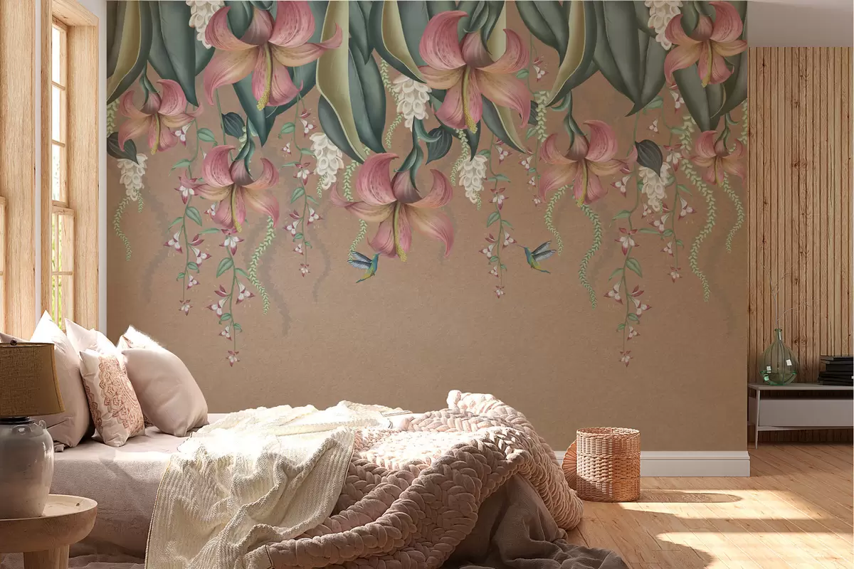 The addition of the wall mural featuring a delicate botanical motif with hanging lilies, flowers, and hummingbirds transforms the living room into a serene oasis. The design's soft hues complement the beige and neutral light tones, creating a harmonious balance. The intricate floral details breathe life into the space, while the hummingbirds add a touch of whimsy. This mural enhances the overall atmosphere, encouraging relaxation and connection with nature, making the living room feel more inviting and vibrant.