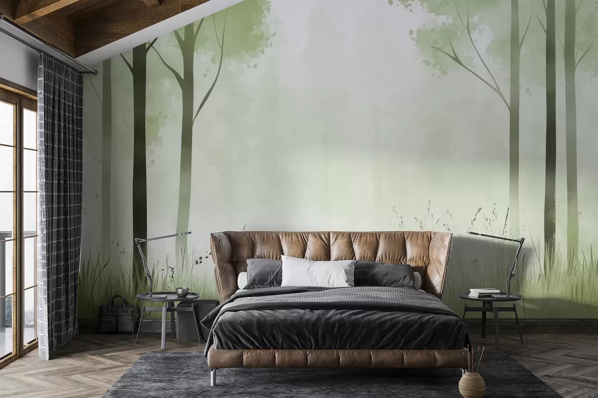 The addition of the watercolor forest mural transforms the living room into a serene retreat. The gentle hues of green evoke a calming atmosphere, reminiscent of a peaceful morning in nature. The misty trees and lush grass create depth, making the space feel more expansive and inviting. This natural landscape encourages relaxation, subtly enhancing the overall ambiance. The pastel tones harmonize beautifully with furniture and decor, allowing for a cohesive and tranquil environment that brings the essence of the outdoors inside.