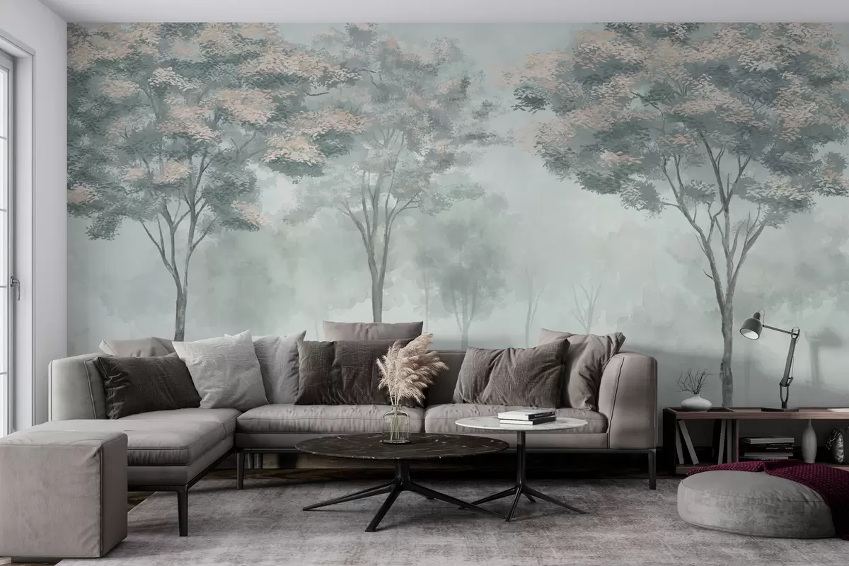 The addition of the Misty Forest Silhouette mural in shades of green, light gray, and beige transforms the living room into a serene retreat. The soft pastel colors create a calming atmosphere, enhancing the sense of openness and tranquility. The forest theme brings nature indoors, inviting a peaceful ambiance that encourages relaxation. This harmonious backdrop pairs beautifully with neutral decor, making the space feel both modern and inviting. The overall effect is a breath of fresh air, elevating the room's decor effortlessly.