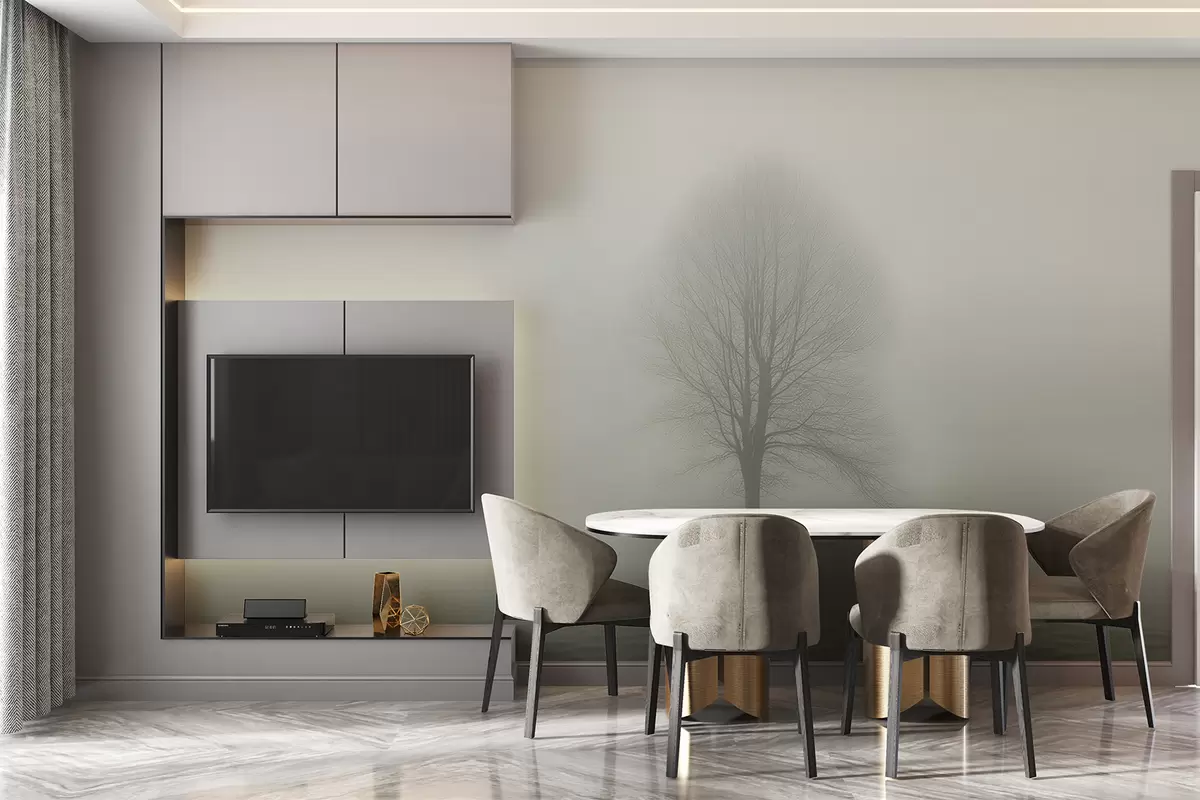 The addition of the Wall mural “Tree in the fog” in dark green hues brings a serene and calming atmosphere to your living room. The gradient effect complements the neutral light, creating depth and softness. The mural draws attention to the natural beauty of the solitary tree, enhancing the space's tranquility. This artwork harmonizes with surrounding decor, infusing the room with a sense of peace while encouraging relaxation and contemplation, making it an inviting retreat.