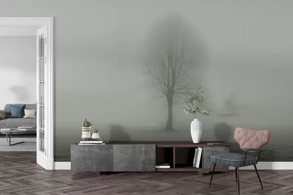 The addition of the Wall mural “Tree in the fog” in dark green hues brings a serene and calming atmosphere to your living room. The gradient effect complements the neutral light, creating depth and softness. The mural draws attention to the natural beauty of the solitary tree, enhancing the space's tranquility. This artwork harmonizes with surrounding decor, infusing the room with a sense of peace while encouraging relaxation and contemplation, making it an inviting retreat.