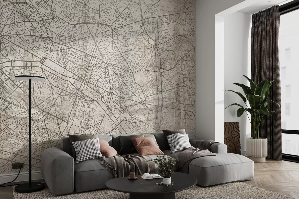Transforming your living room with the Paris city map mural brings a chic and sophisticated ambiance. The intricate line drawings and architectural elements evoke a sense of wanderlust, inviting conversations about travels and dreams. The beige tones seamlessly blend with your décor, creating a warm and inviting atmosphere. This wall art serves as a stunning focal point, enriching the space with culture and elegance. The mural not only enhances the visual appeal but also adds a layer of depth, making your living area feel more expansive and thoughtfully designed.