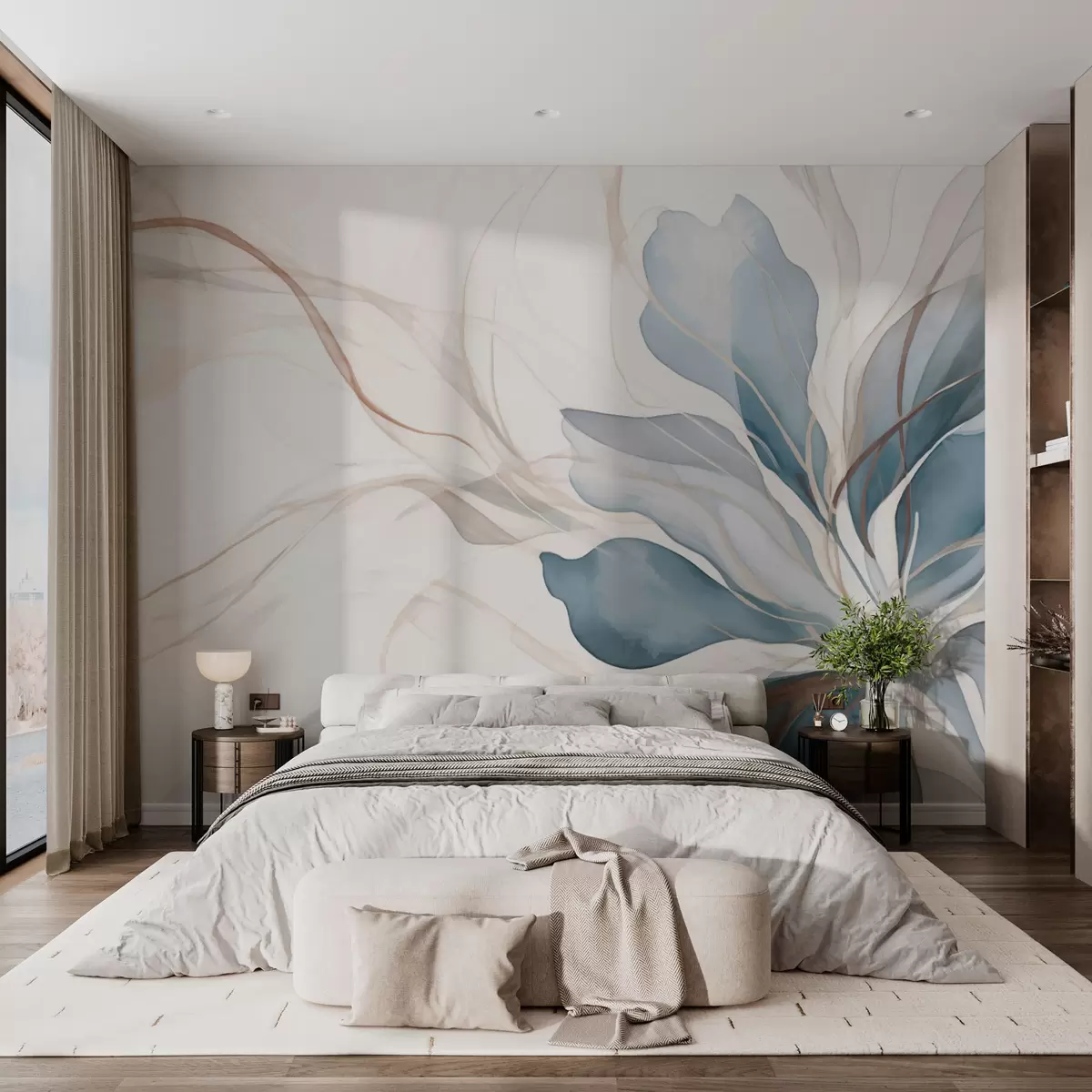The addition of the Delicate large flower mural transforms the living room into a serene oasis. The soft watercolor hues blend harmoniously with the space, creating a tranquil atmosphere. The neutral light accentuates the flowing lines and gentle shapes of the floral design, inviting nature indoors. This stunning mural infuses life and elegance into the room, making it a perfect backdrop for relaxation and gatherings, evoking a sense of peace through its flora and fauna inspiration.