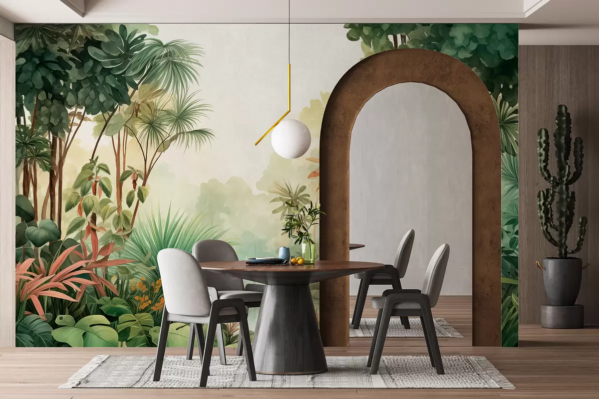 Transforming your living room with the Watercolor jungle forest mural introduces a refreshing escape into nature. The vibrant depiction of palm trees and lush greenery enhances the atmosphere, creating a serene and inviting space. This design breathes life into the room, fostering a sense of tranquility and connection to the outdoors. The interplay of flora and fauna creates a harmonious backdrop, encouraging relaxation and inspiring creativity. The mural becomes a stunning focal point, effortlessly elevating the overall aesthetic of your home.