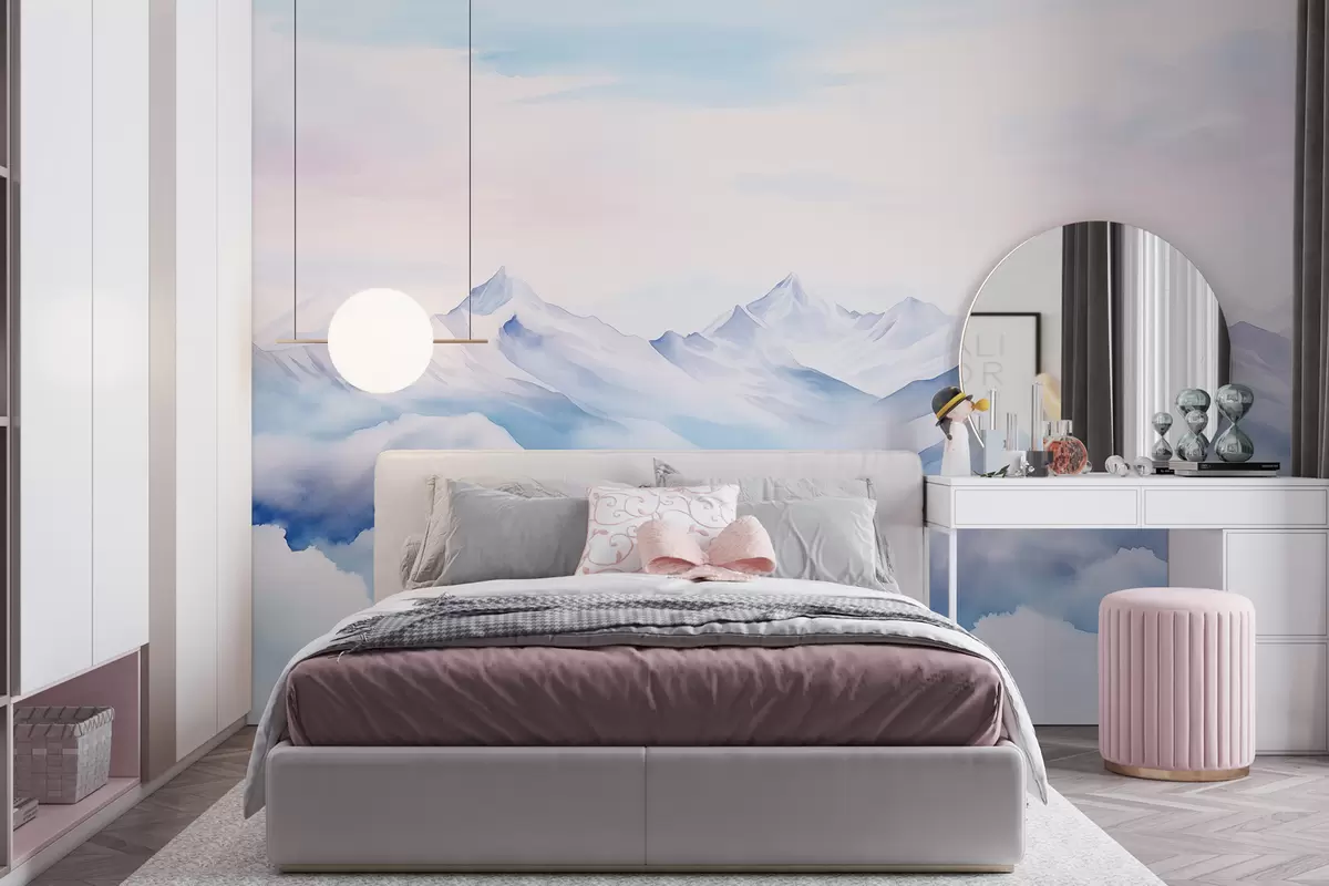 Adding the watercolor mountain landscape mural in soft purple hues transforms the living room into a serene retreat. The gentle pastel colors evoke a sense of calmness, creating a soothing atmosphere that invites relaxation. The majestic mountain peaks add depth and character to the space, making it feel more expansive and connected to nature. This artwork enhances the overall aesthetic, serving as a stunning focal point that harmonizes beautifully with other decor while encouraging a tranquil ambiance throughout the room.