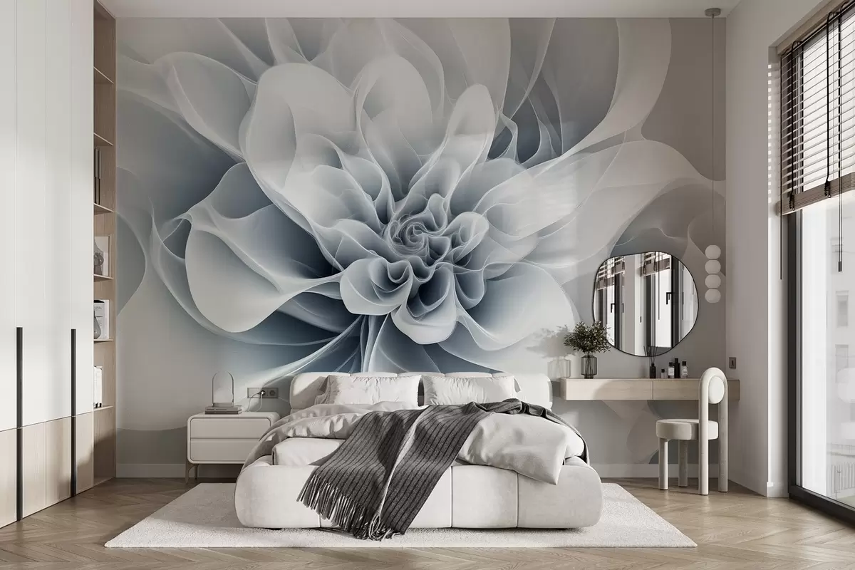 Adding the elegant abstract flower mural in soft blue tones transforms the living room into a serene oasis. The smooth lines create a calming atmosphere, enhancing the space with a contemporary touch. The neutral light interacts beautifully with the mural, making it a focal point that draws attention while remaining subtle. The 3D effect of the flowers offers depth, inviting a sense of modern dance as the design seems to flow gracefully across the wall, enriching the overall aesthetic and ambiance of the room.