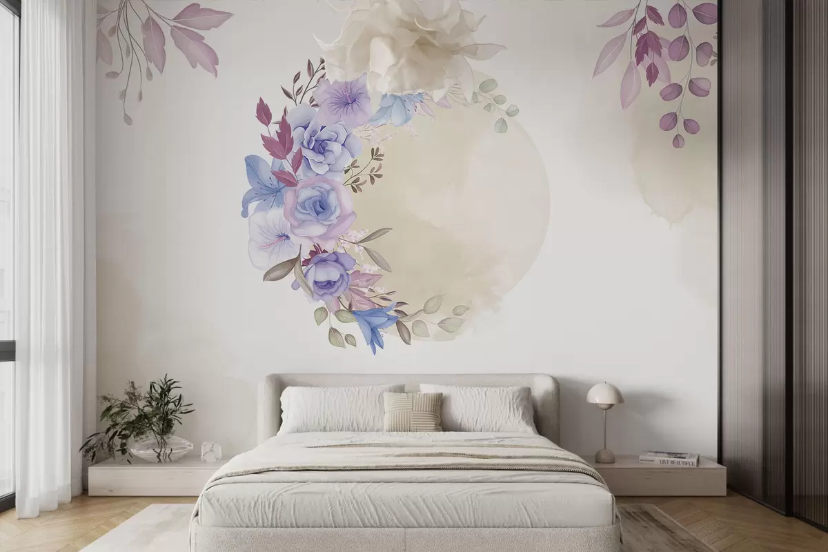 Transforming your living room with the delicate crescent-shaped flowers in watercolor style creates a serene and inviting atmosphere. The soft hues harmoniously blend with neutral light, enhancing the space's overall brightness. The watercolor elements add a touch of artistry, making the wall a focal point without overwhelming the senses. This refreshing décor evokes a calming ambiance, reminiscent of gentle moonlit nights, perfect for relaxing or entertaining guests while adding depth and elegance to your interior design.