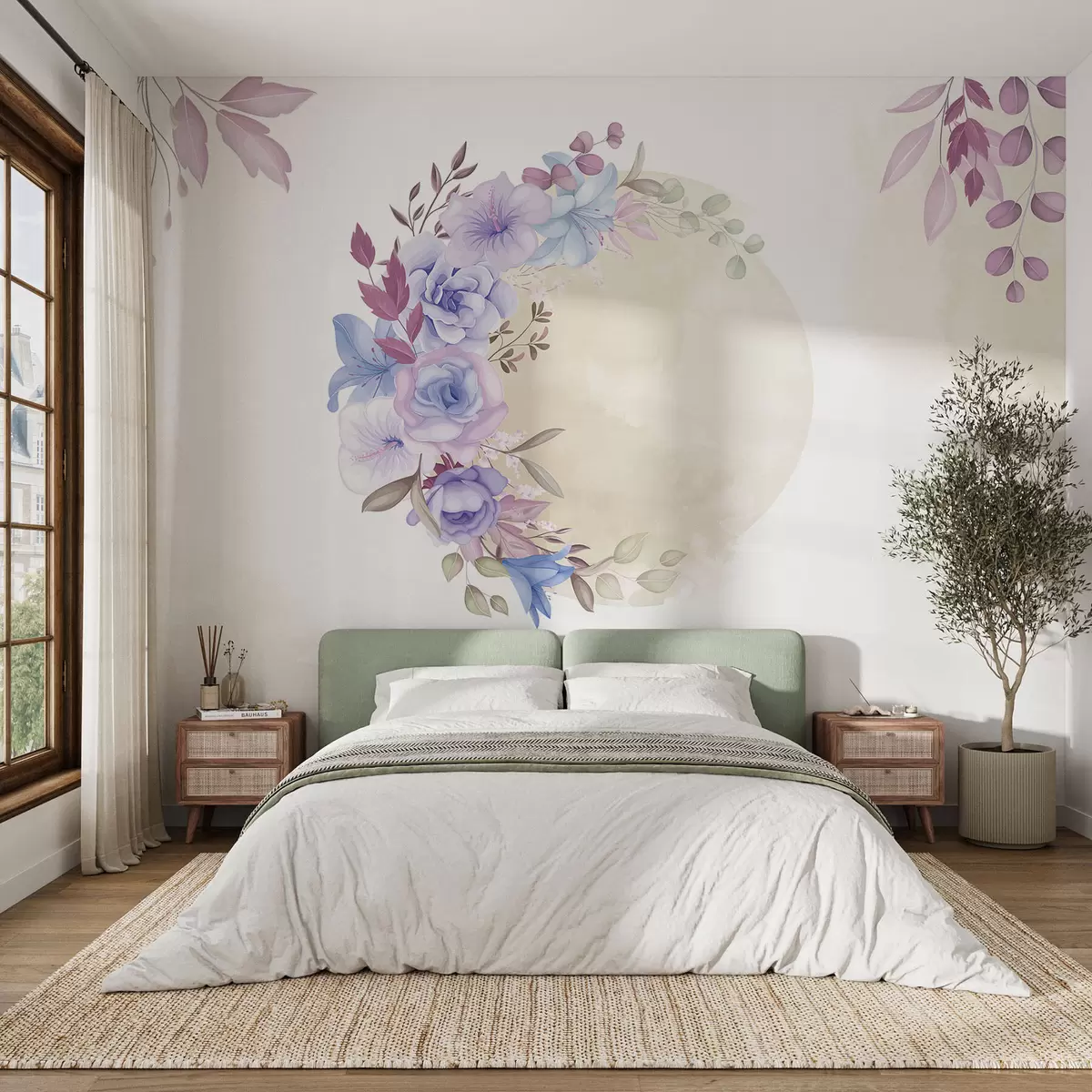 Transforming your living room with the delicate crescent-shaped flowers in watercolor style creates a serene and inviting atmosphere. The soft hues harmoniously blend with neutral light, enhancing the space's overall brightness. The watercolor elements add a touch of artistry, making the wall a focal point without overwhelming the senses. This refreshing décor evokes a calming ambiance, reminiscent of gentle moonlit nights, perfect for relaxing or entertaining guests while adding depth and elegance to your interior design.
