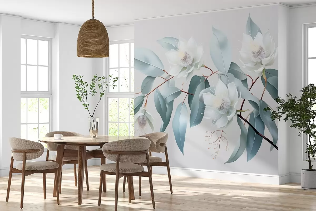 The addition of Jasmine flower wall murals in soft grey colors transforms the living room into a tranquil oasis. The delicate floral design, combined with the gentle tones, creates a serene atmosphere that invites relaxation. This nature-inspired artwork adds depth and elegance, enhancing the room’s aesthetic without overwhelming it. The graceful blooms and leaves bring a soothing touch of flora and fauna, making the space feel fresh and open, perfect for both lively gatherings and quiet evenings.