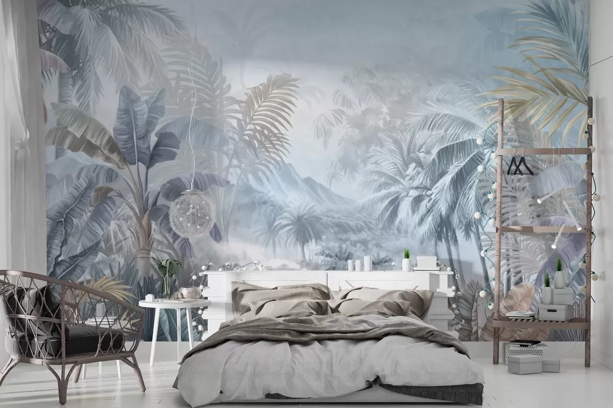 Transforming your living room with the Tropical Forest wall mural in soft blue tones brings a refreshing ambiance. The serene palm trees create a tranquil escape, while the neutral light enhances the calming atmosphere. The cyanotype effect adds depth, making the space feel airy and spacious. This mural marries vibrant nature with subtle hues, inspiring relaxation and a sense of connection to the outdoors. Overall, it elevates the aesthetic, inviting warmth and serenity into your home.