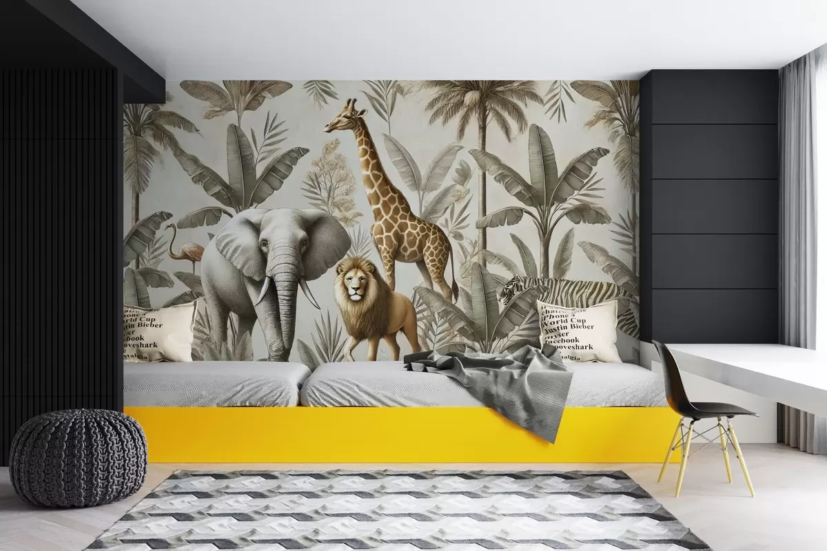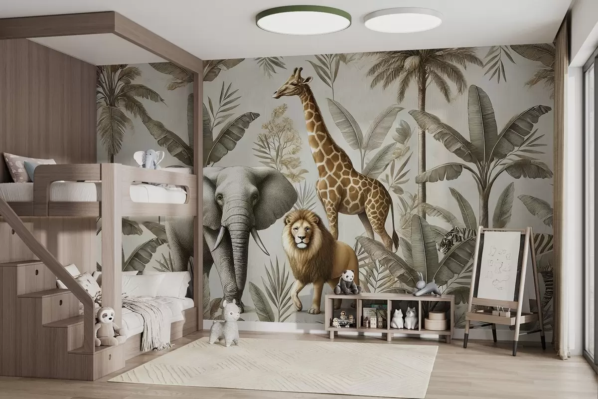 The addition of the Safari children's wallpaper has transformed the living room into a vibrant jungle oasis. The elegant coloration and depiction of wild animals create a playful yet sophisticated atmosphere. Light interacts beautifully with the neutral tones, enhancing the sense of spaciousness and warmth. Each wall is a window into a tropical landscape, making the space feel alive and inviting. This mural not only captivates the imagination of children but also adds an artistic touch that appeals to adults.