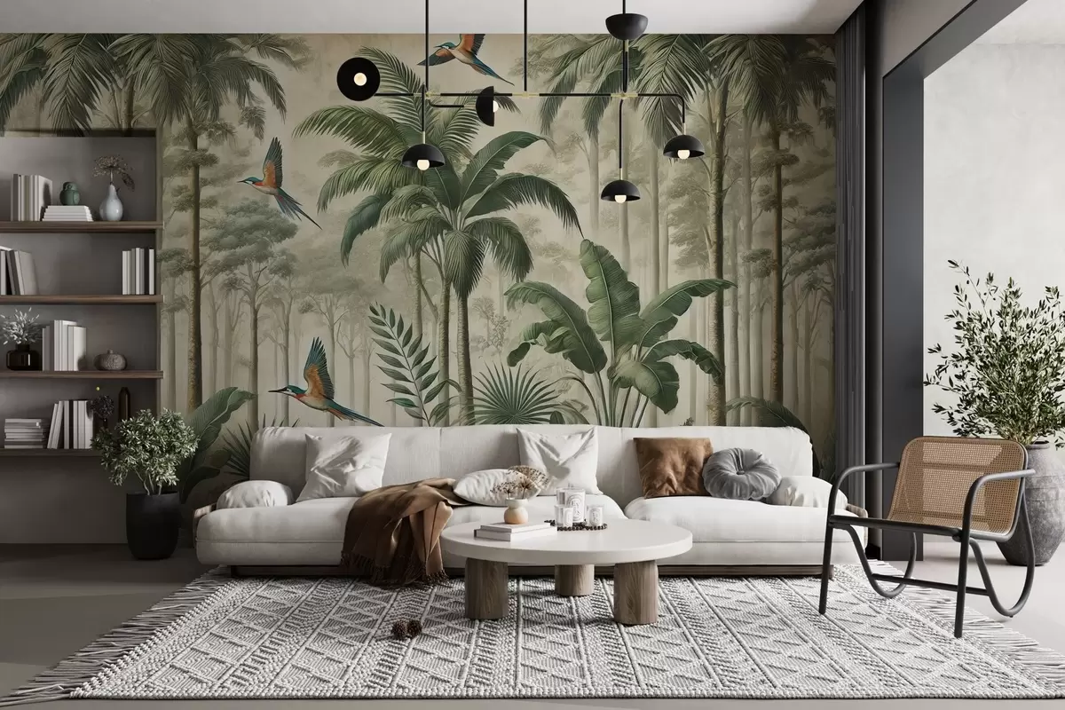 Transforming your living room with the Wall Murals Panorama featuring a tropical landscape and vibrant birds brings a refreshing atmosphere. The mural introduces lush tropical trees, invigorating green hues, and rich flora and fauna, creating a tranquil retreat. Natural elements draw the eye and evoke a sense of serenity, making the space feel more expansive and alive. This stunning backdrop enhances the overall aesthetic, inviting a touch of nature indoors while inspiring relaxation and creativity. The ambiance now resonates with warmth and vitality.