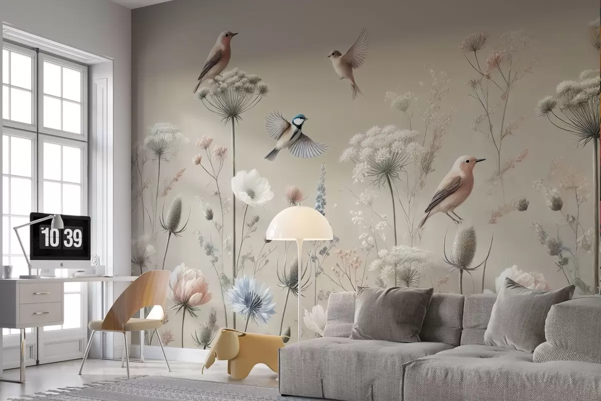 Transforming your living room with the wall mural of delicate wildflowers and birds brings a serene and inviting atmosphere. The soft beige background enhances the neutral light, creating a calming effect that balances the vibrant flora and fauna. The whimsical arrangement of flora juxtaposed with graceful birds adds a touch of nature, fostering a sense of tranquility. This elegant decor choice breathes life into the space, making it feel warm and welcoming while blending harmoniously with various interior styles.