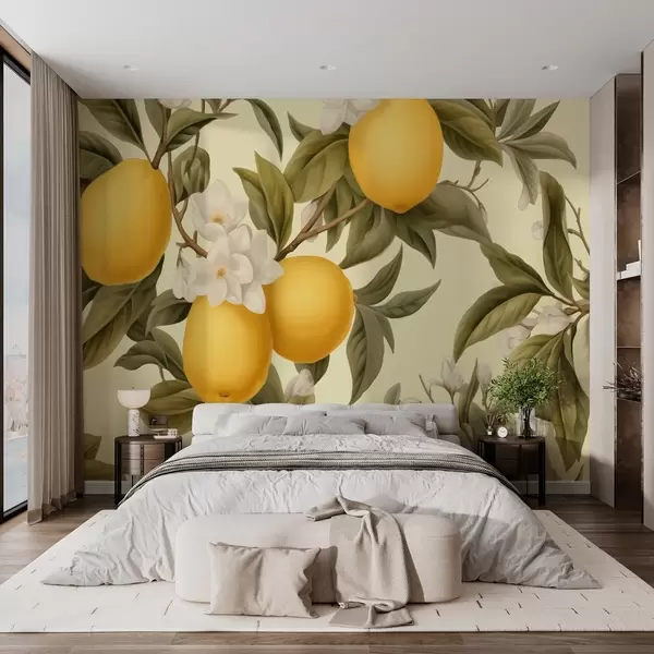 The addition of wall murals featuring juicy lemons and white flowers transforms the living room into a refreshing and inviting space. The vibrant citrus fruits bring a burst of color, creating a lively yet neutral light ambiance that enhances the room's atmosphere. The greenery of the leaves adds a natural touch, making the environment feel more serene and uplifting. This design choice not only brightens the walls but also evokes a sense of calm, fostering a cheerful and harmonious living area. The overall effect is both stylish and revitalizing.