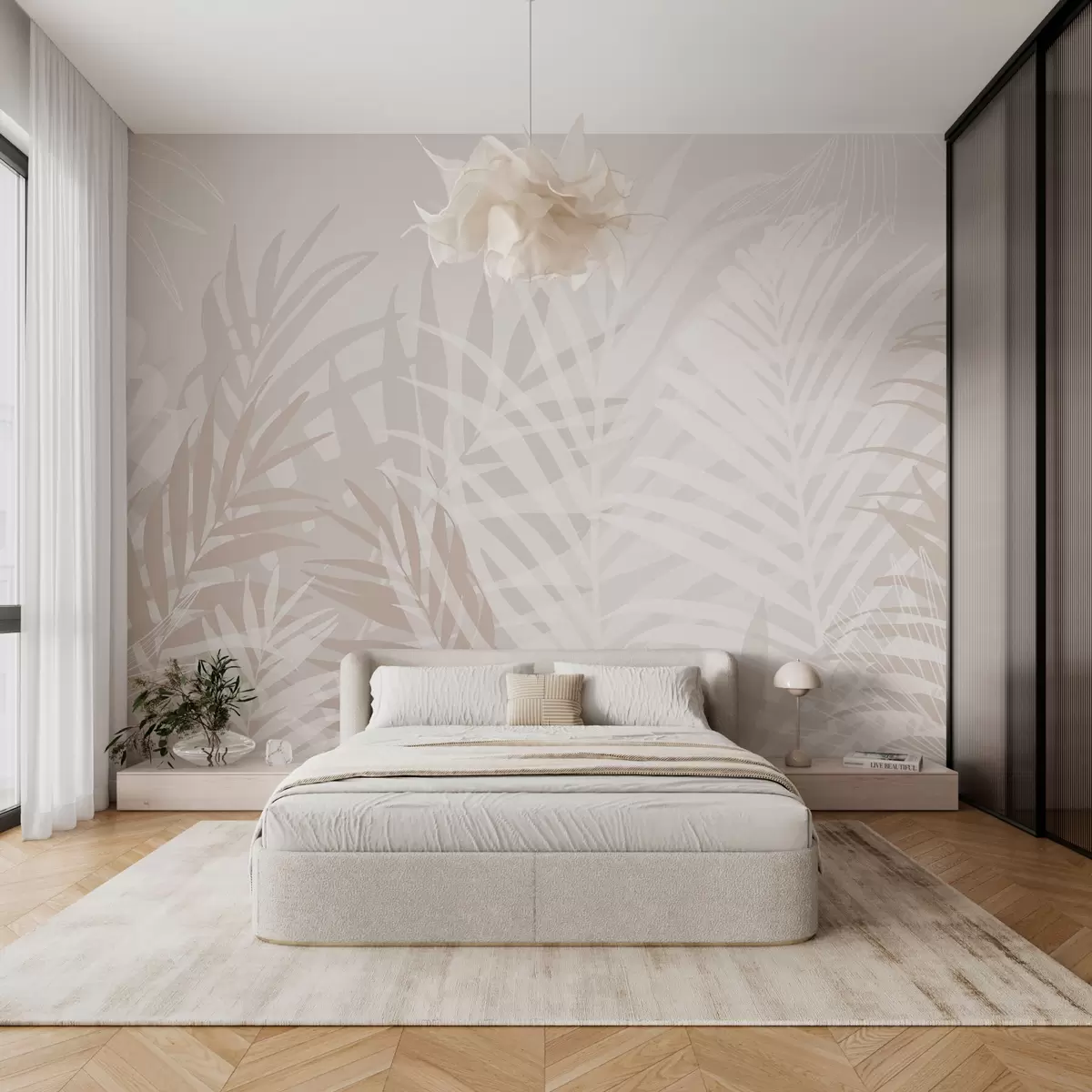 Transforming your living room with trendy tropical leaves adds a refreshing and inviting atmosphere. The soft beige background beautifully complements the palm leaves, creating a serene and calming vibe. This wall mural introduces an element of nature indoors, making the space feel more open and airy. The subtle colors and dynamic leaf patterns enhance your decor while promoting relaxation. Overall, the mural infuses energy into the room, making it a perfect backdrop for gatherings or quiet moments.
