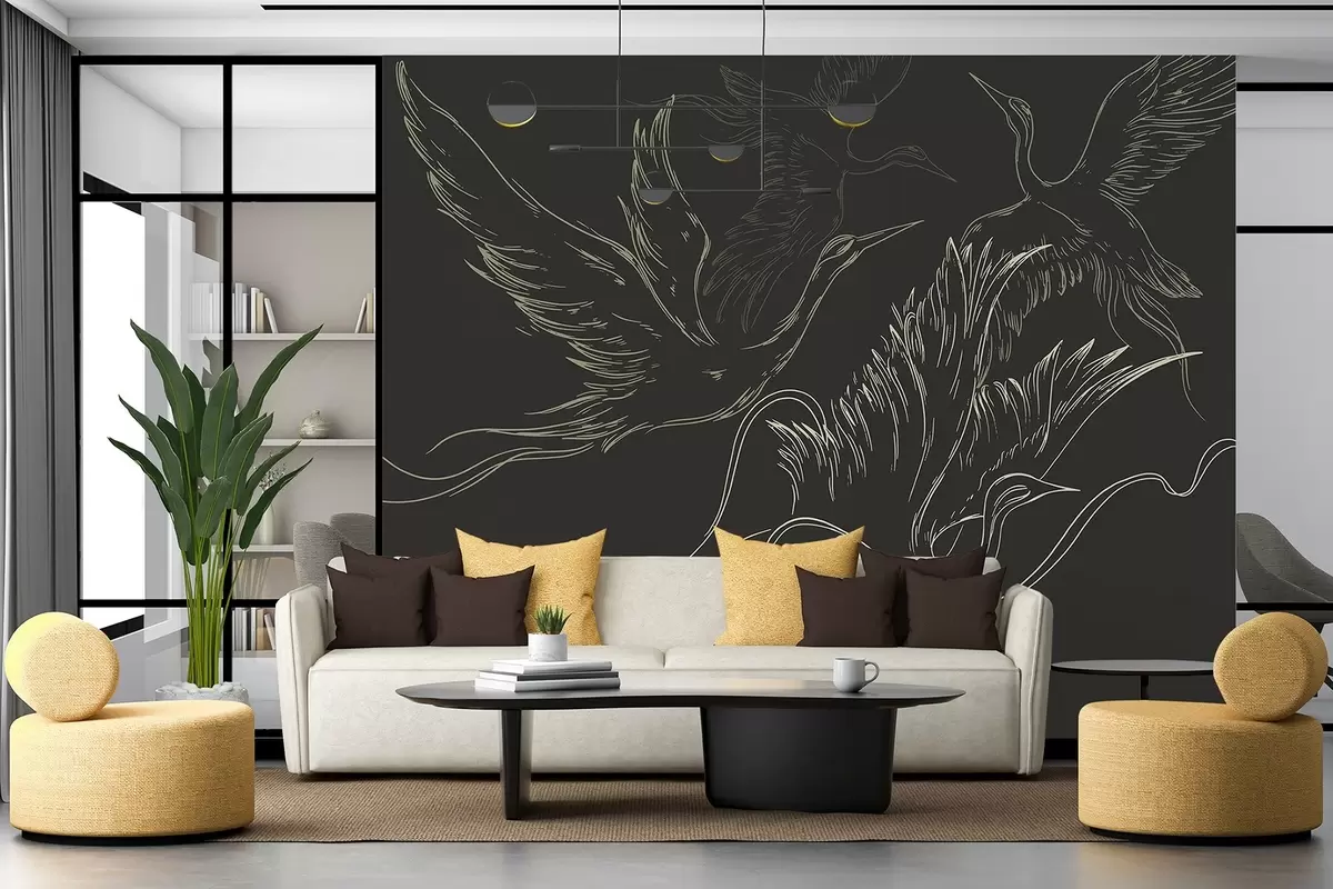 The addition of the wall mural featuring birds flying over a dark background transformed the living room into a serene escape. The minimalistic line art creates a striking contrast that draws the eye, adding depth without overwhelming the space. The subtle depiction of flora and fauna establishes a harmonious connection with nature, making the room feel more open and inviting. This artistic choice enhances the overall ambiance, promoting a sense of tranquility and sophistication in the living environment.