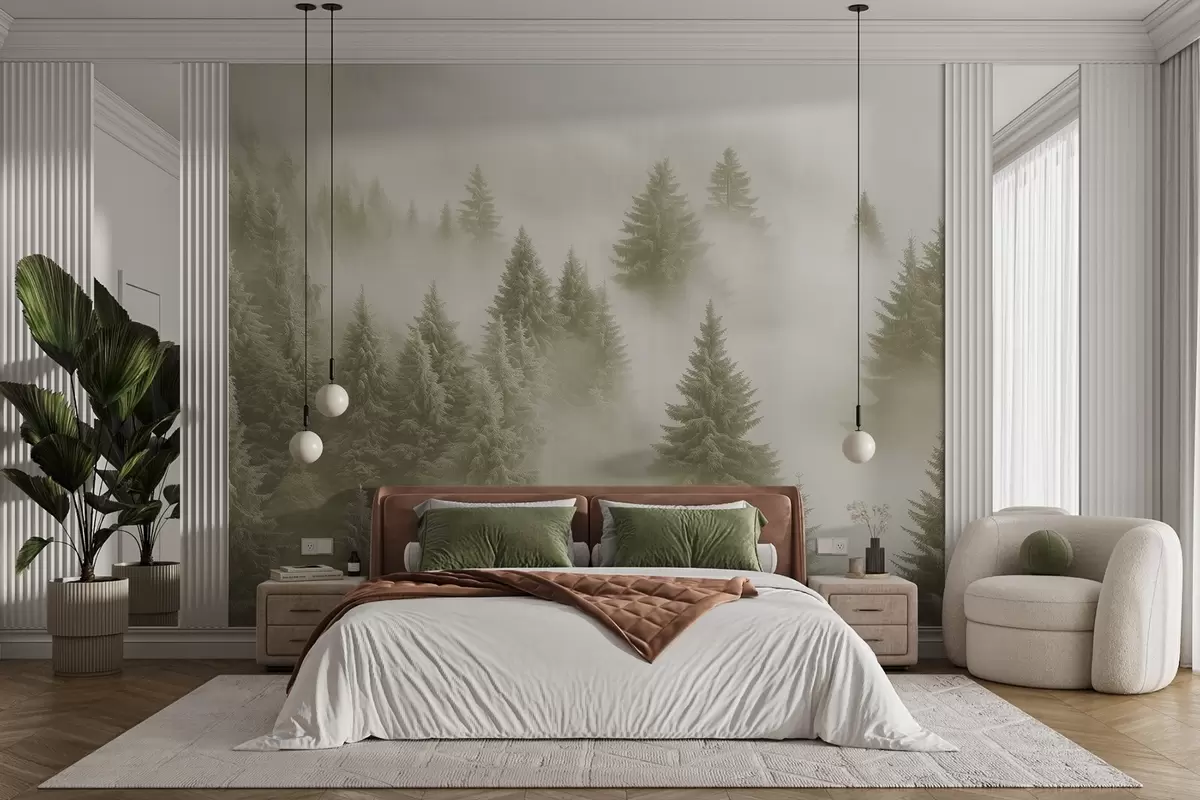 Transforming your living room with the wall mural of a snowy morning forest enveloped in thick fog introduces a serene, tranquil ambiance. The soft green shades evoke a sense of peace and connection to nature, enhancing the overall atmosphere. This backdrop harmonizes beautifully with beige furnishings, creating a warm and inviting space. The subtle sage green tones bring a refreshing touch, promoting relaxation and calmness, while giving the room a spacious feel that encourages leisurely moments and gathering with loved ones.