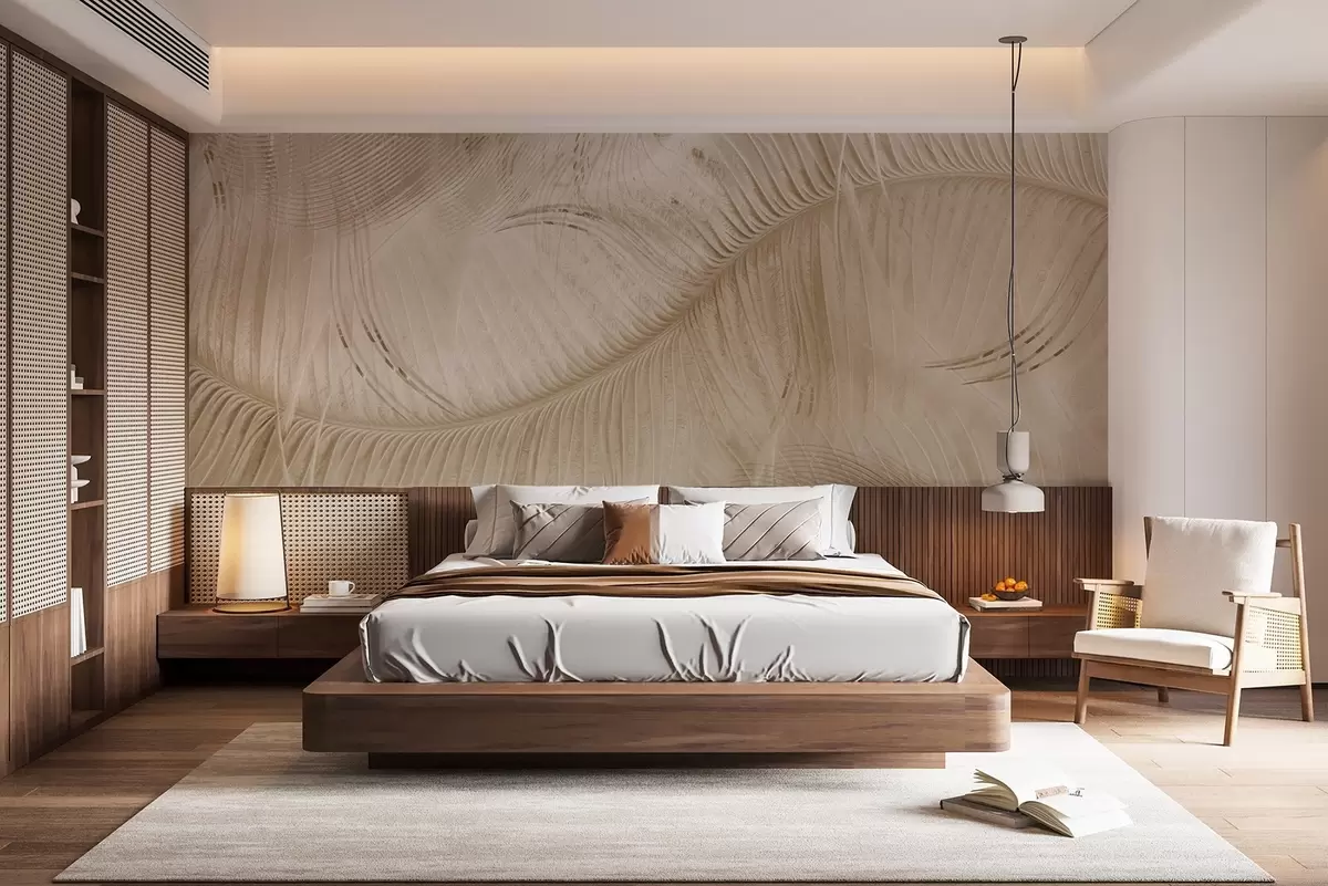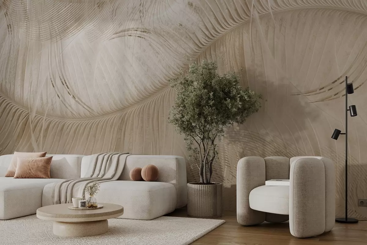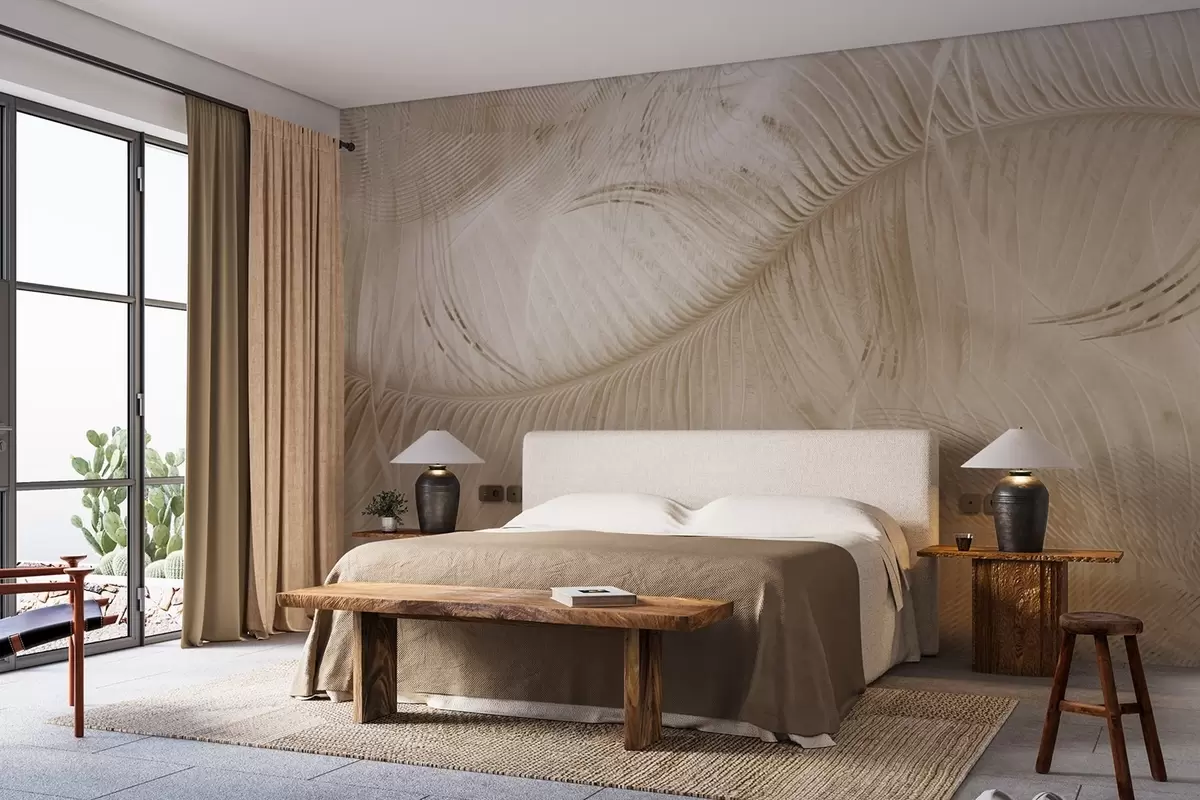 The addition of the Wall murals Light feather texture in beige tones transformed the living room into a serene tropical retreat. The subtle beige palette creates a calming atmosphere, effortlessly integrating the design with various decor elements. The delicate patterns evoke the essence of tropical trees, bringing an organic touch to the space. This harmonious backdrop not only enhances the room's warmth but also invites relaxation and a sense of tranquility, perfect for unwinding after a long day.
