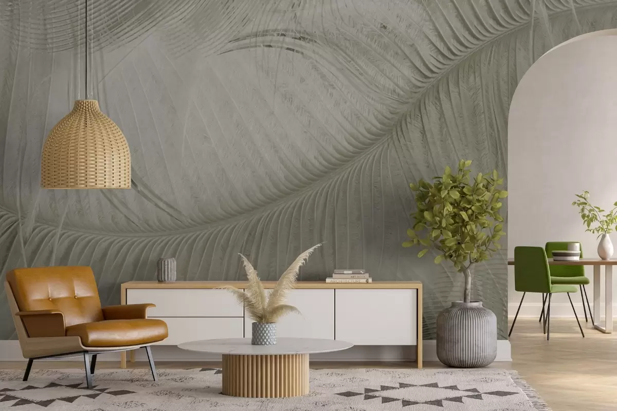 Transforming your living room with the Wall murals Light feather texture in green tones brings a refreshing ambiance reminiscent of tropical flora and fauna. The soft green gradients create a serene backdrop that emphasizes natural beauty, while the feather-like patterns evoke a sense of tranquility. This design enhances the space, making it feel more spacious and inviting. The mural acts as a focal point, seamlessly blending with indoor plants or natural wood accents, reinforcing a soothing, nature-inspired theme throughout your home.