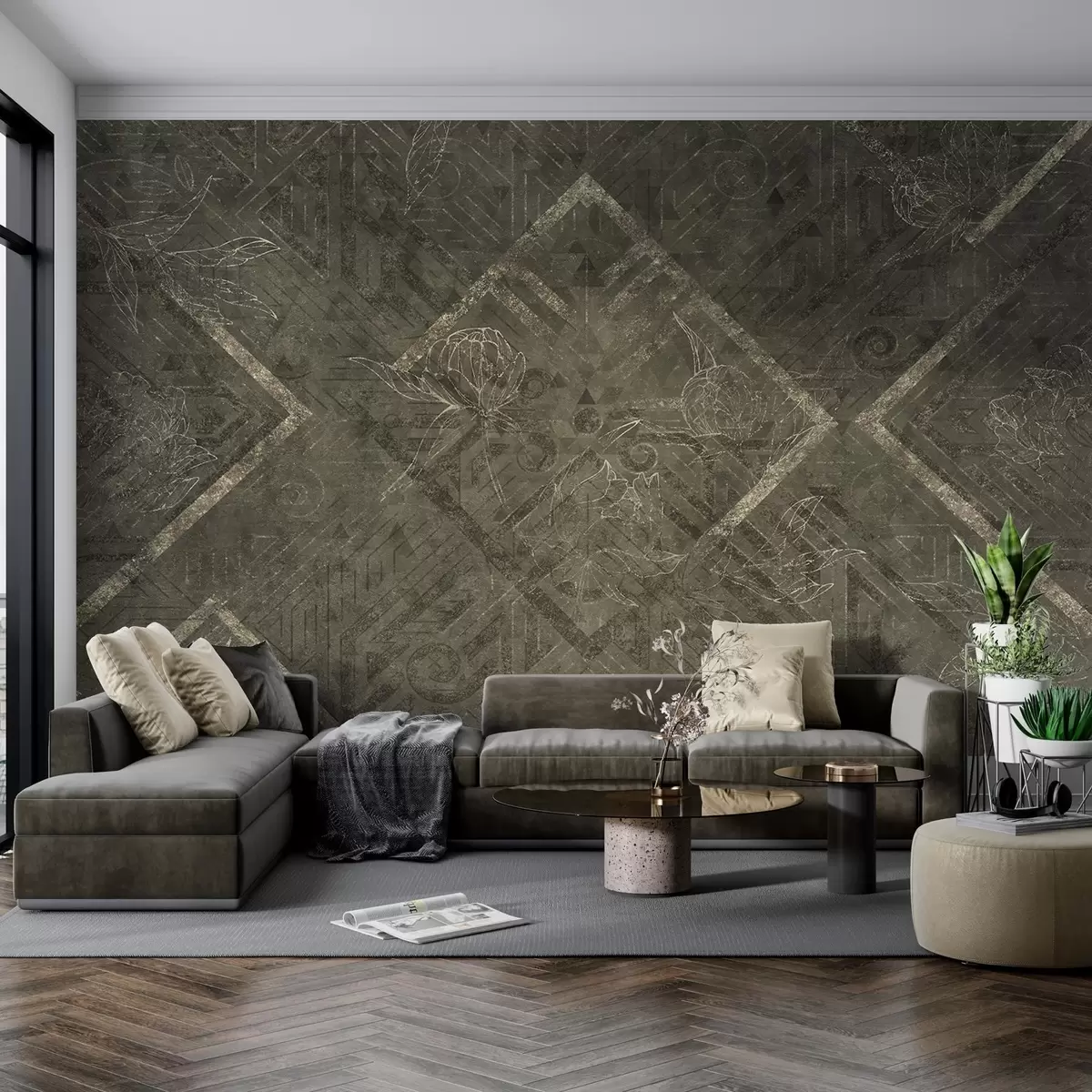 The transformation of the living room with the Wall murals Grunge texture featuring floral patterns in yellow adds an uplifting charm to the space. The vibrant yellow elements enliven the walls, creating a warm and inviting atmosphere. The botanical art seamlessly integrates with the grunge texture, offering a striking contrast that enhances the room's character. This unique graphic pattern draws the eye, making the space feel dynamic and artistic while maintaining a cozy, sophisticated vibe amid the gray tones.