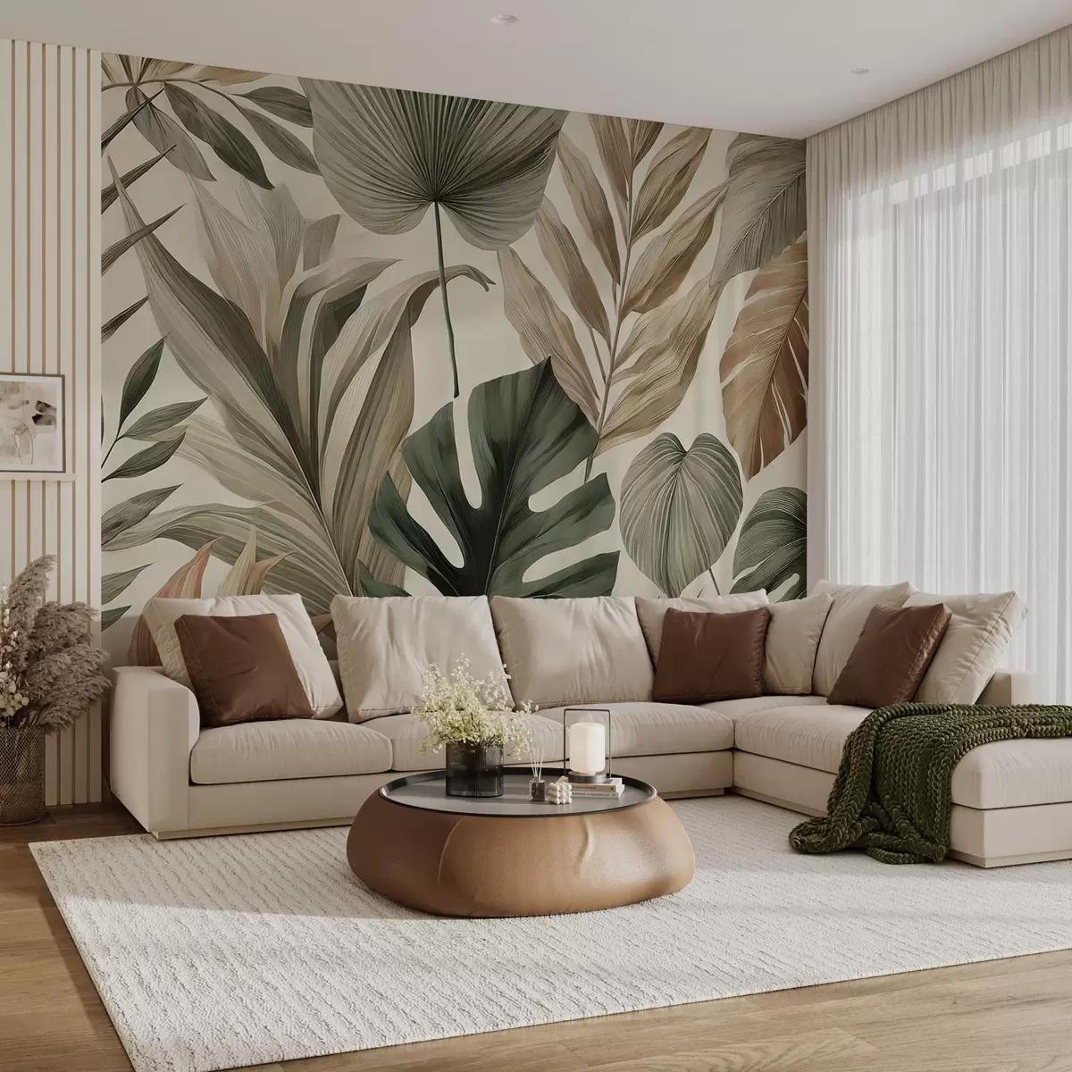 Transforming the living room with the wall mural of large tropical leaves in delicate pastel shades brings a refreshing serenity to the space. The soft greens and muted tones create an inviting ambiance, making the room feel more open and lively. The intricate patterns of palm leaves and tropical trees infuse a sense of nature, promoting relaxation and tranquility. This elegant design harmonizes beautifully with existing decor, enhancing the overall aesthetic while providing a peaceful retreat from the outside world.