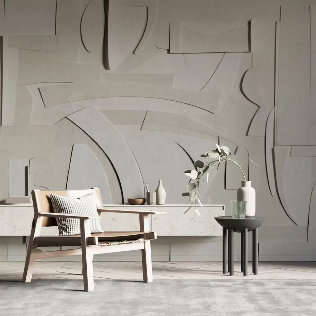 The addition of Wall murals Relief concrete wall Nr. w02110 transforms the living room into a modern and stylish space. The textured design introduces a contemporary flair, creating visual interest against a neutral backdrop. The muted tones harmonize beautifully with the room's overall aesthetic, while the concrete finish adds a touch of industrial elegance. Enhanced by soft, neutral light, the mural contributes depth and dimension, making the living area feel more inviting and spacious. This update breathes new life into the interior decor, ensuring a warm and sophisticated atmosphere.